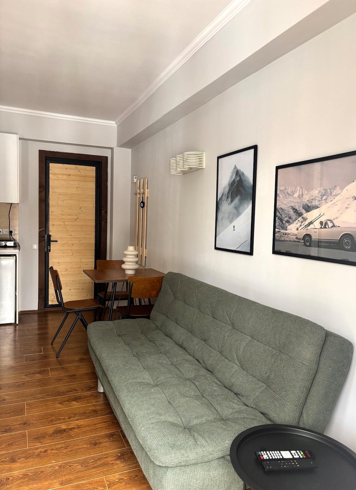 Magnificent and cozy studio style apartment. Fully renovated with modern furniture and amenities for maximum comfort. Harmonious nature with exterior and interior to match, perfect for peaceful vacation and warm memories. Cozy balcony with a view over a pine forest that provides fresh air and natural harmony on every season. ski-in/ski-out, just seconds away from newly renovated Kokhta lift + ski storage. Unit comes with a small kitchenette + amenities, TV, Wi-Fi, washing machine and etc.