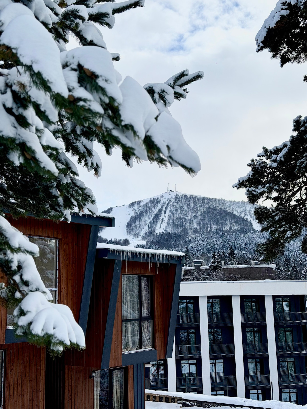 You'll have a great time at this comfortable place to stay. You’ll need one minute to get to ski slope and skating stadium. Next to the building you can taste georgian national food, at the restaurant. Also theres forest-park nearby. There’s also children place to enjoy, everything you need is nearby the building