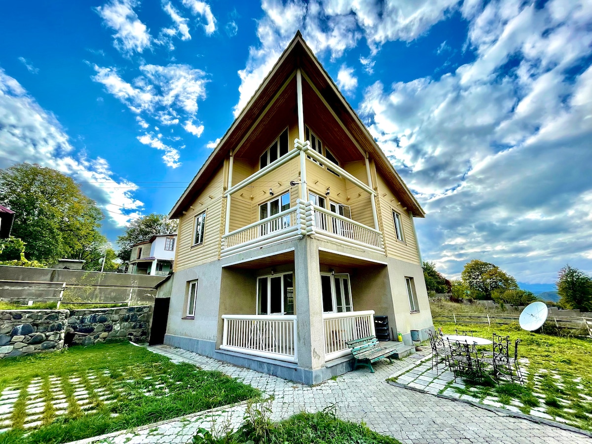 "Sweet home" is located near the main road at the entrance to the city of Borjomi near the Mtkvari River, 1.5 km from the center. The house and furniture in the house are made of environmentally friendly materials. It also has a veranda and a garage. The house is a studio with a dining area and full kitchen equipment, 1 bedroom, 1 toilet, cable TV, Wi-Fi, central heating, refrigerator, washing machine.
