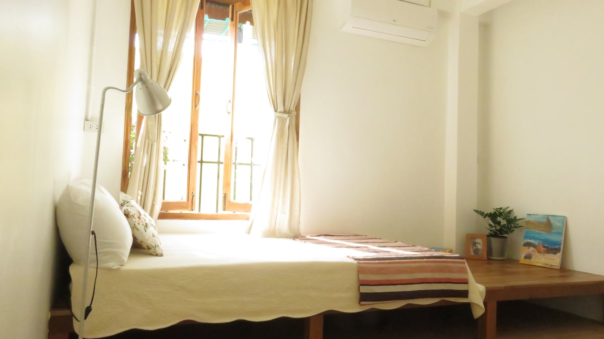 This simple yet stylish open air 1 bedroom is cool, clean, and comfortable. The perfect place to come back to and relax in after a day out exploring Bangkok. The spacious 1 bedroom room has queen size bed, AC, ceiling fans, kitchenette, refrigerator, microwave, dishes, utensils and a private bathroom.