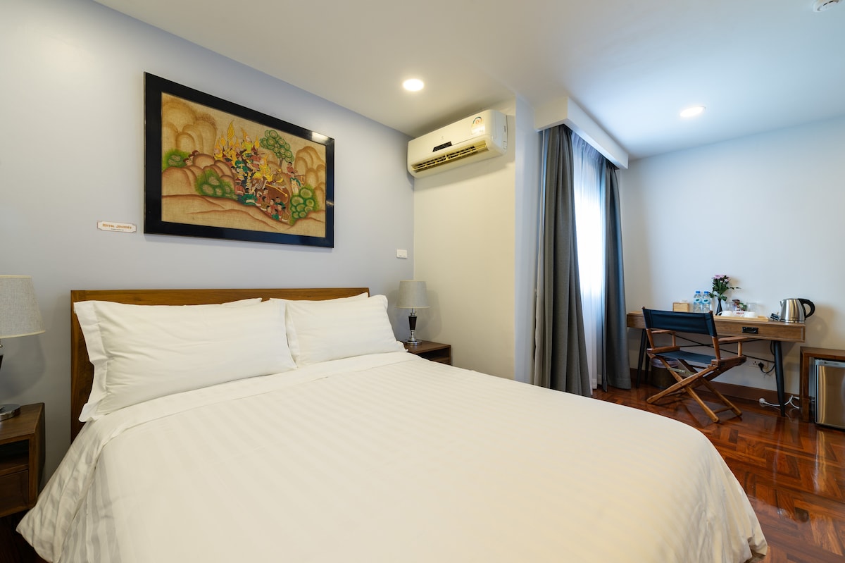 Experience refined luxury in our Dusit Suite at Maneeya Park Residence. This spectacular accommodation features a separate bedroom and living room, offering space and privacy. Indulge in the spacious bathroom with premium amenities. The Dusit Executive Suite includes an in-room refrigerator for added convenience. Enjoy the perks of early check-in and late check-out. For more options, explore our full range of available accommodations to find your perfect Bangkok retreat. High speed internet WFH.