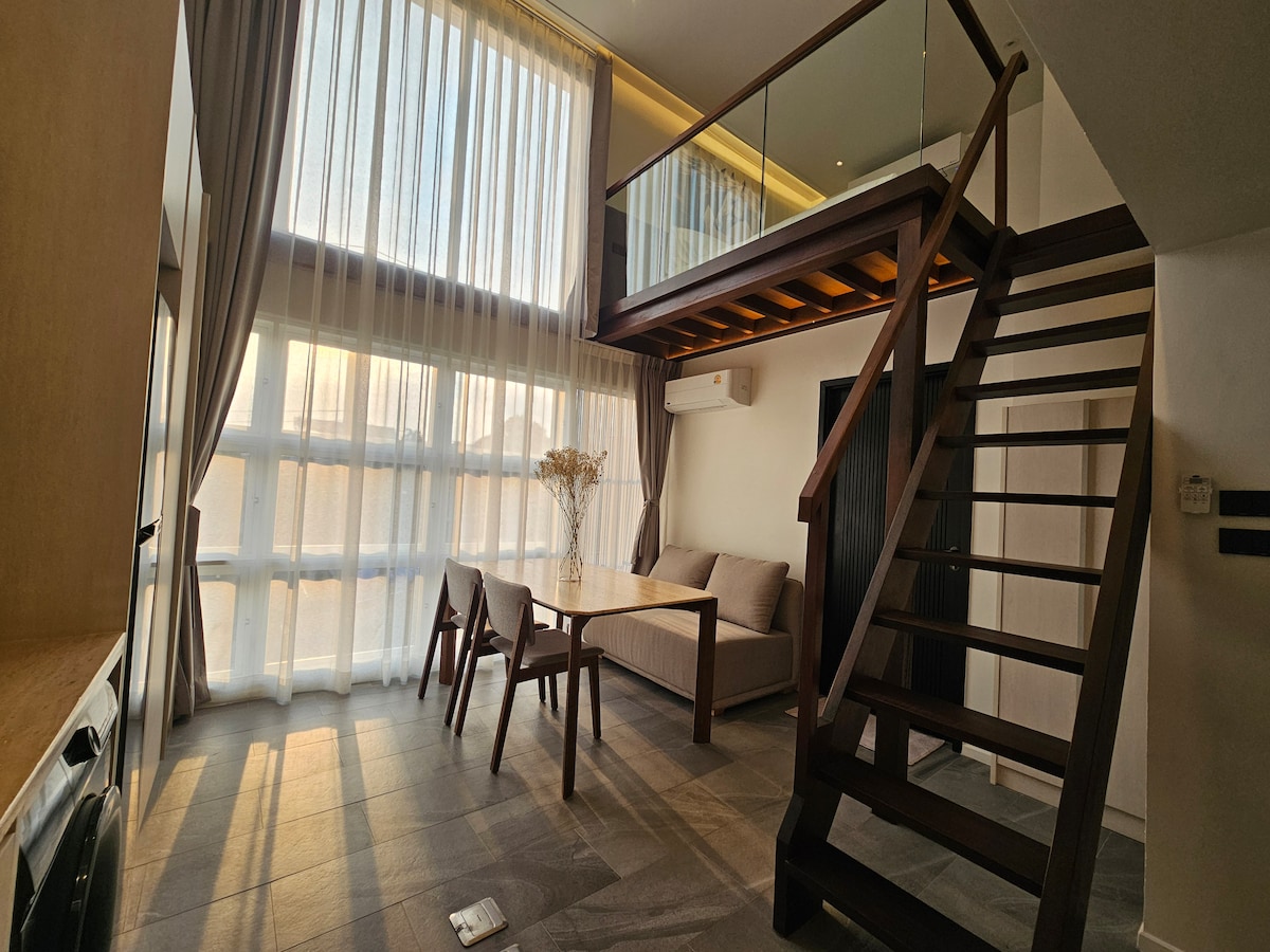 This stylish split-level space features a cozy elevated bedroom overlooking the living area, warm wood finishes, and soft ambient lighting. Enjoy natural light, a compact kitchen, and a comfortable dining corner. Just 450 meters from BTS Punnawithi. Easy city access, peaceful stay, surrounded by local cafés, street food, and everyday conveniences, you’ll experience authentic Bangkok living while staying in a calm, refined retreat.🍁