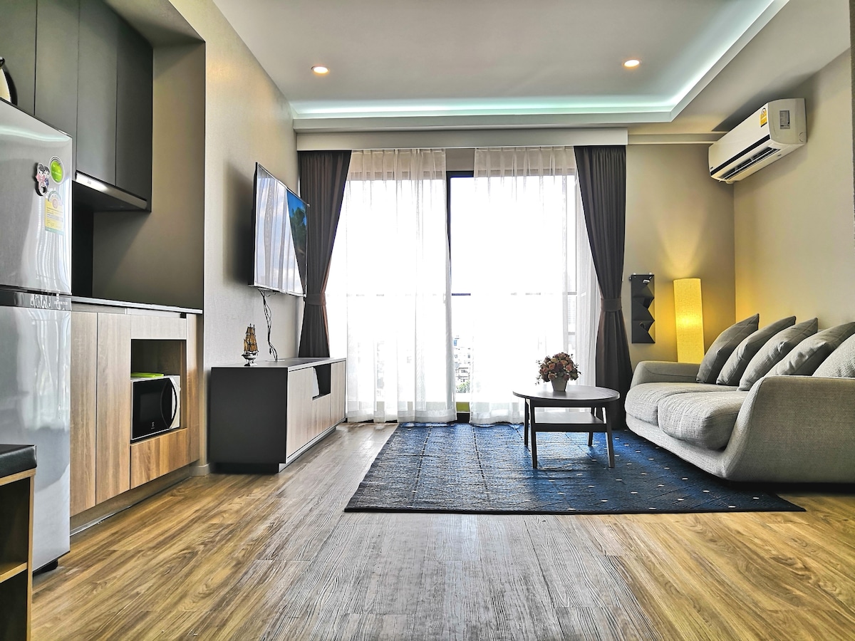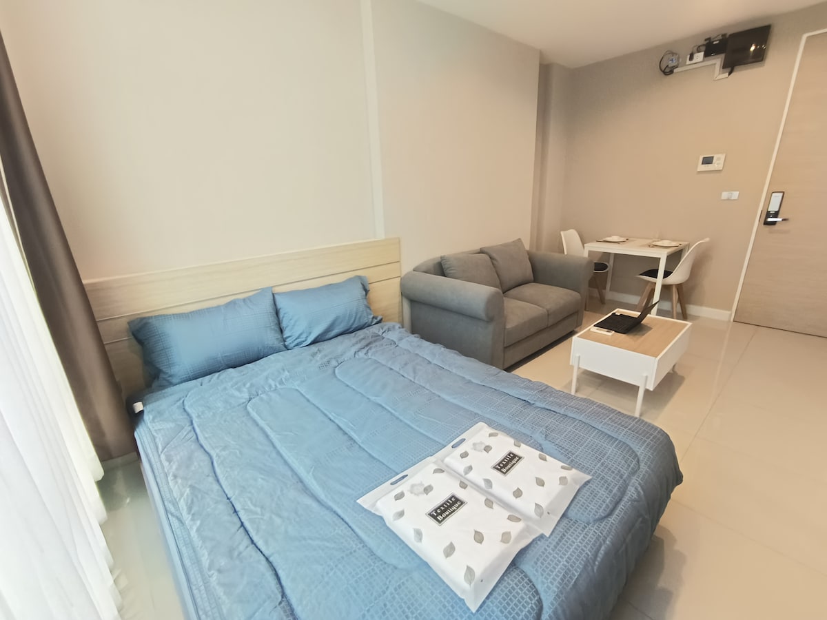 2 bedrooms,2 smart TV , double door refrigerator,digital household appliances, fully equipped kitchen. Free golf car service from lobby to main road (daily 5:30am-24:00pm), it will take around only 1 minute) Opposite supermarket BIG C , near by Tesco Lotus Extra,Movie Plaza , Night market. 独立双卧,主卧高档舒适大床1.8米*2米;副卧1.6米*2.2米超大床.两台大屏智能电视,有线电视及高速网络。免费高尔夫球车往返接送住客到主干道,车程70秒 公寓对面HABITO商业街Boots药妆店,ATM,7-11超市,各国餐厅,星巴克,Subway. 公寓对面BIG C大超市,TESCO LOTUS 易初莲花特大超市,影院,夜市,按摩街