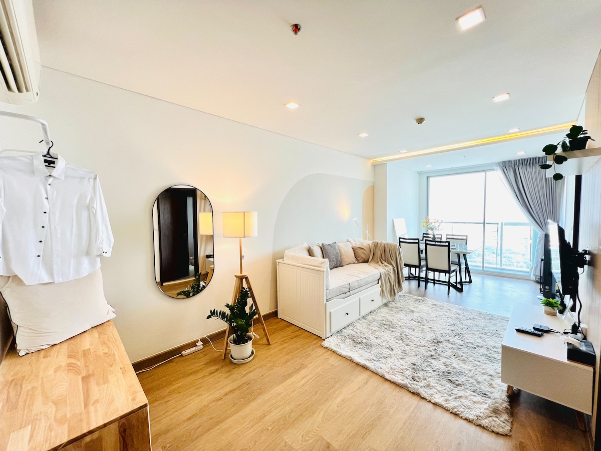 Modern and warm-welcome lobby Perfect for workation Full-lap pool with chilling area Spacious Co-working and Co-kitchen space Game room Fitness room Active facilities like simulated rock climb, basketball, tennis and football field on the top floor of the building In-room facilities : 5.7m floor to ceiling with full size window Electric-adjusted sofa Dining table Washing machine and dryer Kitchen with full equipments Seperated bed room with Queen-size bed with panoramic view Rainshower