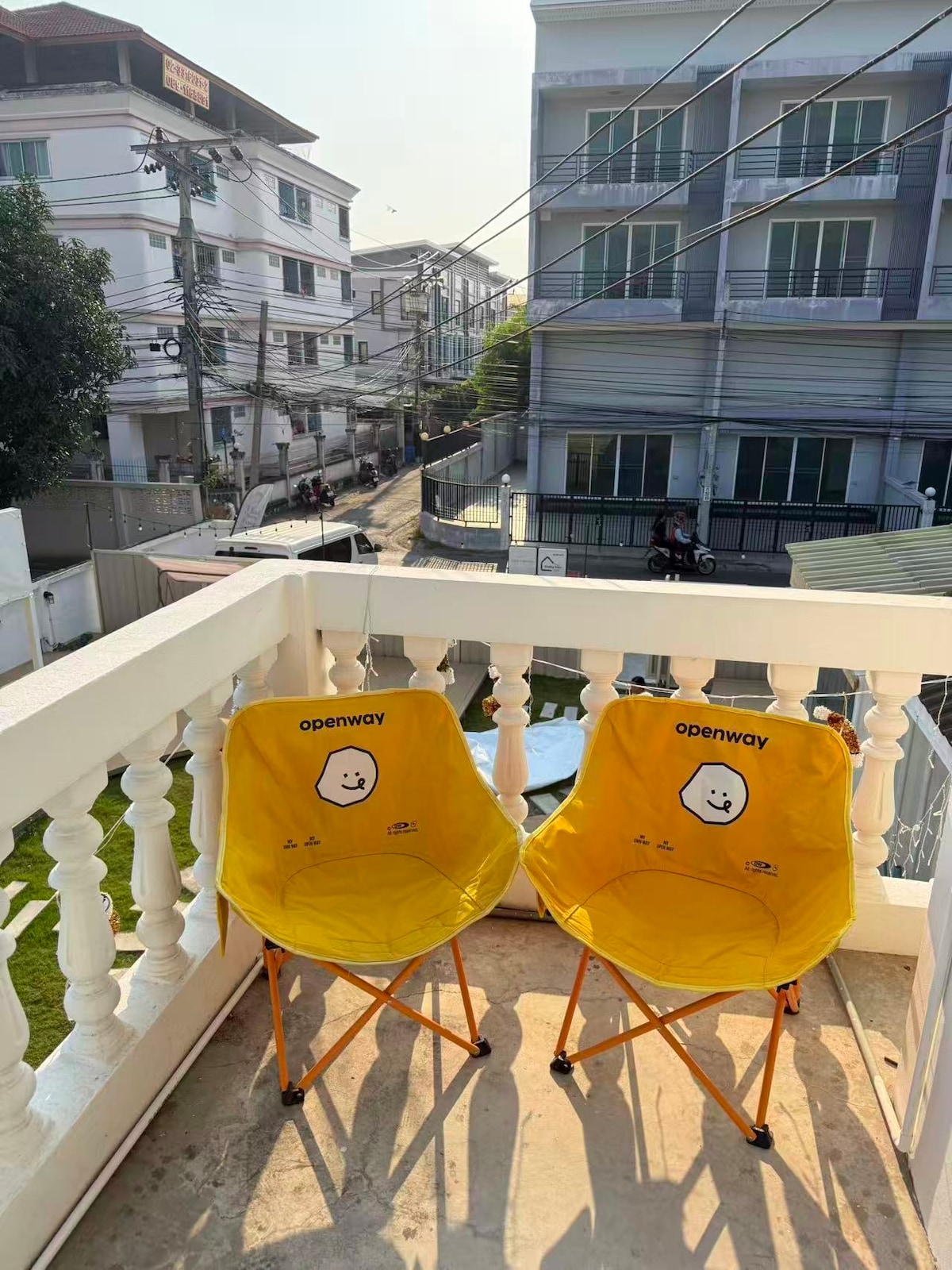 房间在独栋别墅二楼,最中间带阳台的房间。位置在onnut非常热闹的本地街区,边上有Onnut Plaza商场,711也有两个在边上。mokro,big c ,lotus大超市都有,户外有500平米大草坪和露台可以使用,别墅一楼部分区域是按摩店,外面有公共厨房灶台微波炉可以使用,房间12平米,阳台3平米,最多可入住2位成人和1位儿童,有空调,衣柜,梳妆台和椅子,1.8米king尺寸大床可睡2成人1小孩,床垫选用泰国品牌非常舒适,遮光窗帘,有1GB网速宽带wifi,别墅二楼卫生间在房间门口,为共用卫生间(一楼卫生间也可以使用),热水淋浴,吹风机,房源干净整洁漂亮。酒店不提供牙刷请自备,可以在一楼按摩店购买20泰铢,入住期间需要打扫卫生更换床品每次50泰铢,每间房退房都会打扫干净交给下一个住客,此房间不可以带宠物。请看清描述预订。