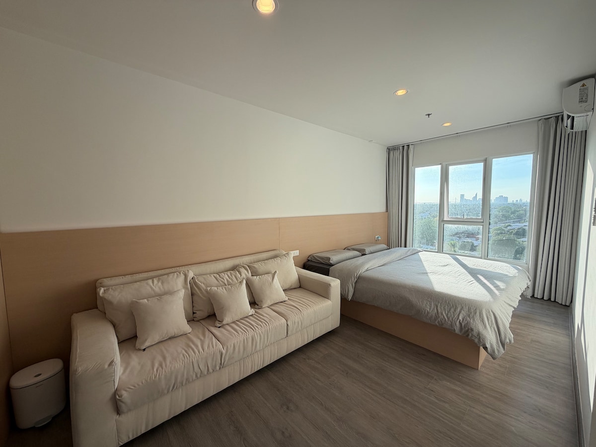 这处房源是曼谷旅行、商务出差、情侣出游的理想之选。位于热门的邦纳(Bangna)核心地段,地处Regent Home Bangna小区内,步行280米即达BTS Bangna站,出行便捷。 • 到素万那普机场:约20分钟车程 • 到四面佛:BTS直达约25分钟 • 到是隆(Silom):BTS转MRT约30分钟 • 上高速到是隆:约15分钟 • 上高速到素坤逸:约12分钟 • 到暹罗古城七十二府:约30分钟 • 到周边大型医院:约10分钟 小区为全新现代社区,配有24小时安保、门禁系统,还有泳池、健身房、空中花园及休闲区,安全舒适。 周边配套成熟,步行可达Mega Bangna、IKEA等大型商场,斜对面即是在建的东南亚最大商场The Bangkok Mall。紧邻BITEC会展中心,车程仅5分钟,是商务参展优选;周边多所国际学校,车程10分钟左右,适合陪读家庭。餐饮、超市、便利店密集,生活便利度极高。 房源空间宽敞舒适,无论是家庭旅行、朋友小聚、商务出差还是情侣出游,都能轻松满足,让每位住客在曼谷拥有惬意安心的旅居体验。