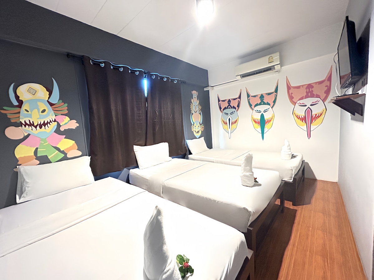 + Hostel is 20 meters from BTS skytrain (1 min walk) + Meet our Quadruple room with private bath in Hostel. + This room is located on 5th floor. It features a comfortable 2 double beds + Our place is located in a prime area, very close to BTS green line, 7-11 nearby, local market and lot of street foods + Wifi 1000 Mbps fiber high speed internet Note: The room is on the 5th floor without a lift.