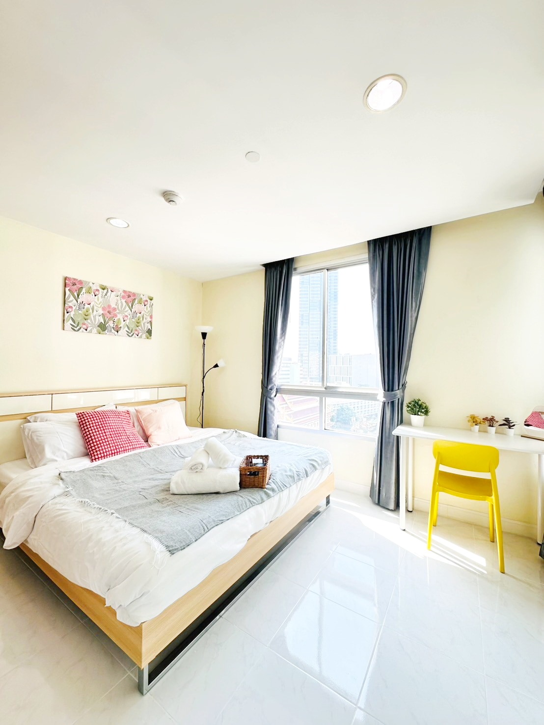 The rooms was decorated with minimal style. You will have an access to pool and gym, which you have to share them with other neighbors. The condo is located in the heart of Bangpu, across from The Ancient City, next to Bangpu municipality and right in front of the Pacific ocean. You can walk along the rock beach on a small street and see lots of enormous ships entering Thai gulf. PS. There is a beach but it not a sand beach. You can sunbathing on a bed in condominium private park.