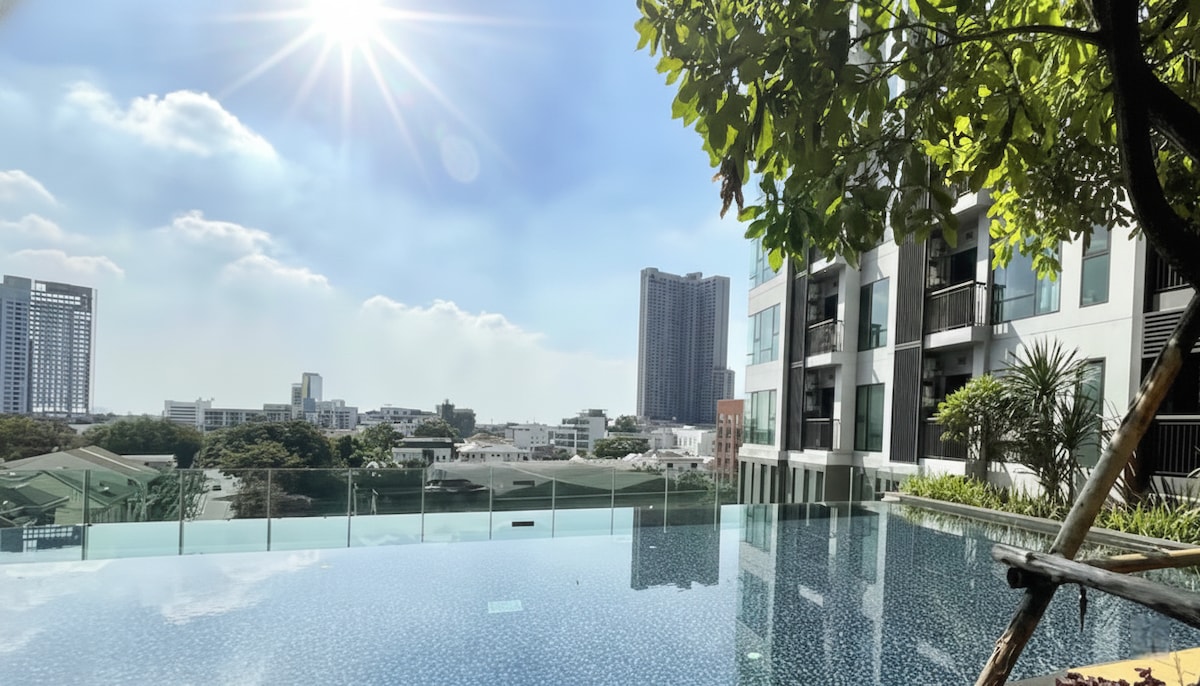 Luxuriously decorated spacious unit of 2 bedrooms and 1 bathroom for up to 4 guests to stay comfortably. 2 mins walk to BTS. Hygiene and security are our top priorities. Room services - Surround Audio to whole room (Bluetooth) - Wifi - Netflix - Body and Hair Shampoo - Hair Dryer - Laundry Machine - Dish&Glass Tableware - Digital Lock Communal facilities - Rooftop Swimming Pool (City View) - Rooftop Garden (City View) - Fitness - Parking