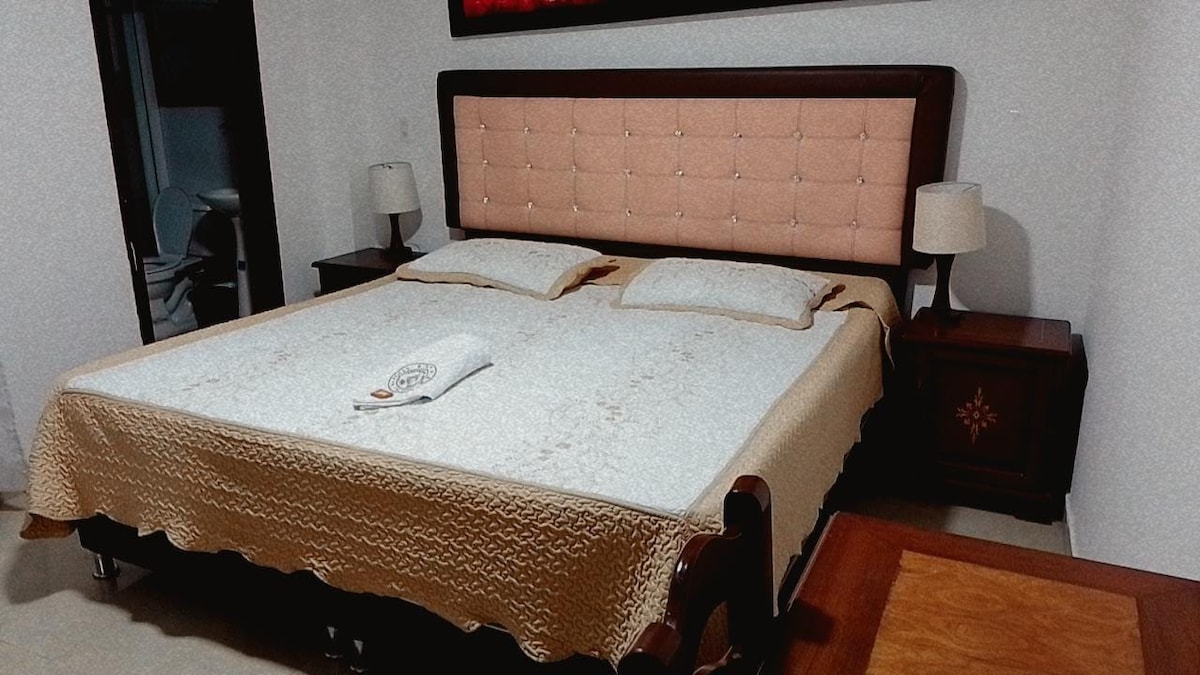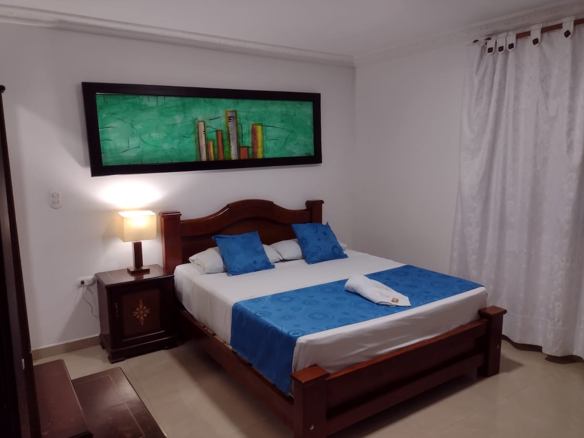 habitación muy confortable con cama Queen y una habitación supletoria alterna, cómoda, amplia y elegante, combina un estilo colonial, rustico y moderno que permite vivir una experiencia única en sus instalaciones. Cuenta con wifi, nevera, sofá cama, tv en cada habitación, ventilador, aire acondicionado, baño amplio con agua caliente, dos lavamanos y desayuno incluido.