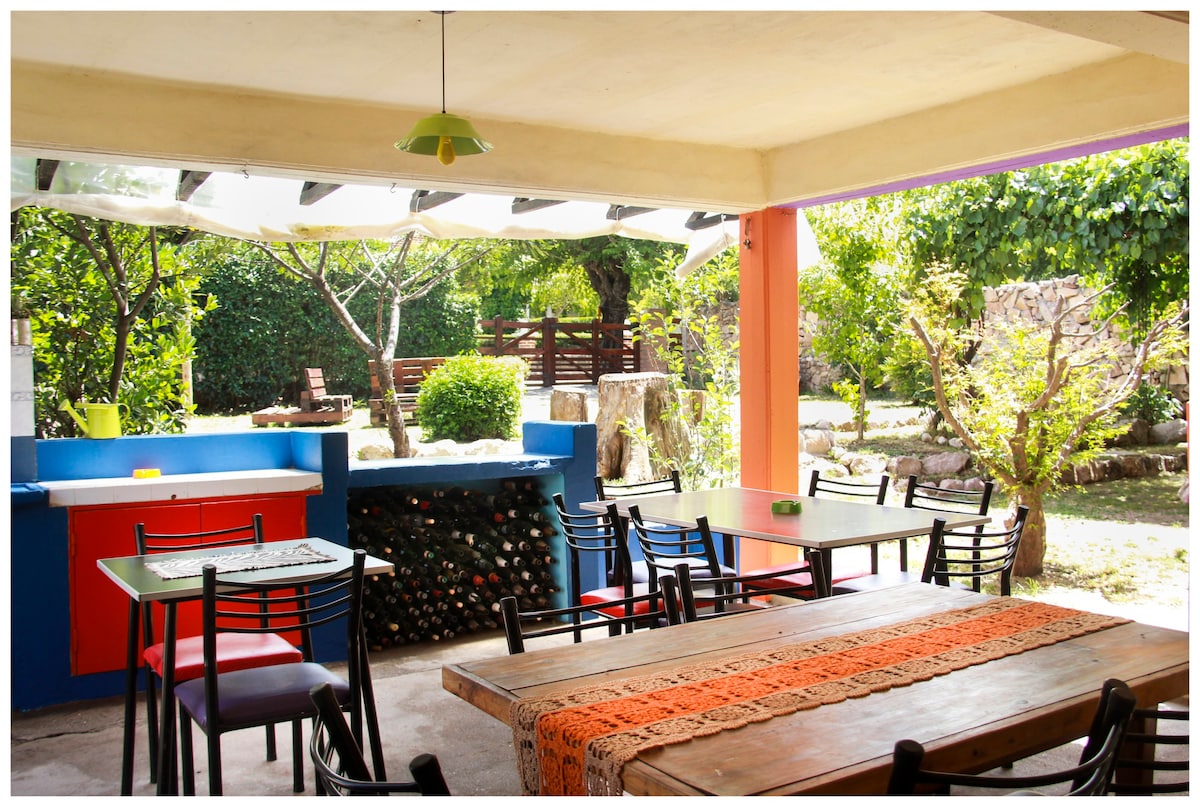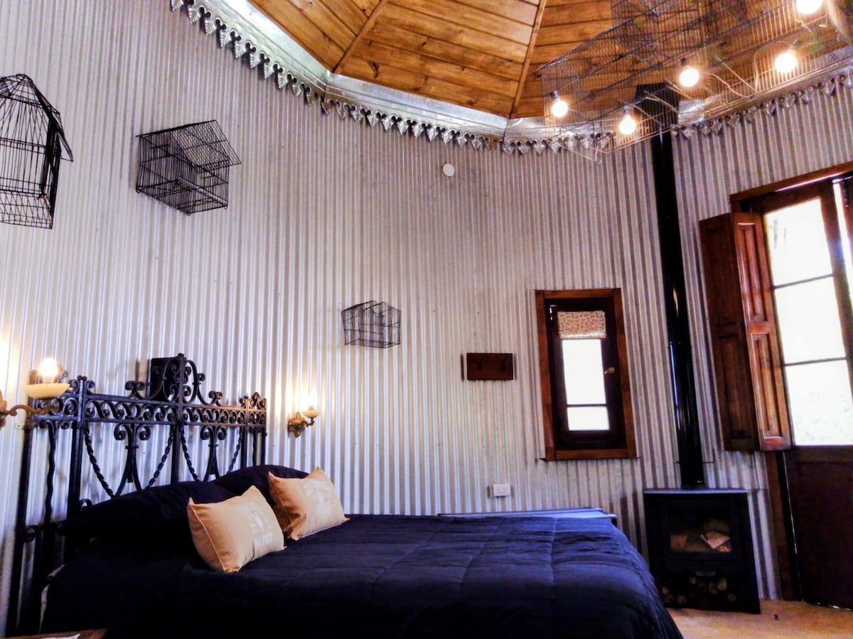 Baño, agua caliente, cocina, cochera, parrilla, WiFi. Un silo de 5.5 de altura, con seleccionadas aberturas antiguas, un micro estanque con playita, un túnel solar en el techo. No es una casa. Te vas a alojar en un silo a 1400msnm. Tenemos perros, gatos, patos, gallos, cabra y gallinas. Ninguno hace daño. TIENE WIFI. DESAYUNO casero y FRESCO INCLUIDO. CADA MAÑANA EN LA TRANQUERA entre 830 y 9am. ESTÁ MUY AISLADO, tambien del calor. Estufa a leña. Ventilador (mejor la brisa con ventanas abiertas)