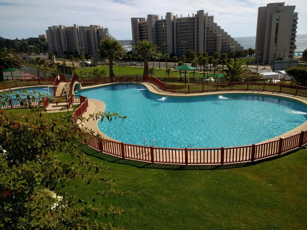 Moderno departamento amoblado de 3 dormitorios y 2 baños, vista al mar y estacionamiento subterráneo, cocina americana full equipada, Tv cable, Wifi fibra óptica, parrilla a gas y todas las comodidades para descansar, todas las ventanas con mallas de protección. Playas de arena blanca y 5 piscinas de aguas cristalinas palmeras , amplias áreas verdes, piscinas, gimnasio, sala de lavado y secado con sistema de pago, actividades diarias en verano. Cercano playa Algarrobo, comercio y restaurantes