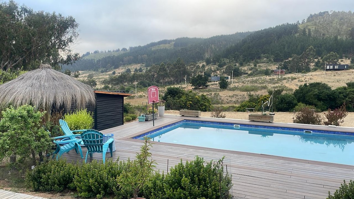 Cabaña “Bosque de Mis Ángeles", exclusiva en medio de la naturaleza, entre el mar y el campo para llenarse de energía. Usted, su familia o amigos, pueden disfrutar de todos nuestros servicios, no se comparten espacios con otros huéspedes, es muy acogedora y cómoda. Es para 4 personas pero está habilitada para 5 con un adicional. Ubicada en una parcela, donde contamos con cancha de tenis playa, piscina, tinaja, sala multiuso y tenemos servicio de masajes, para que su estadía sea única.