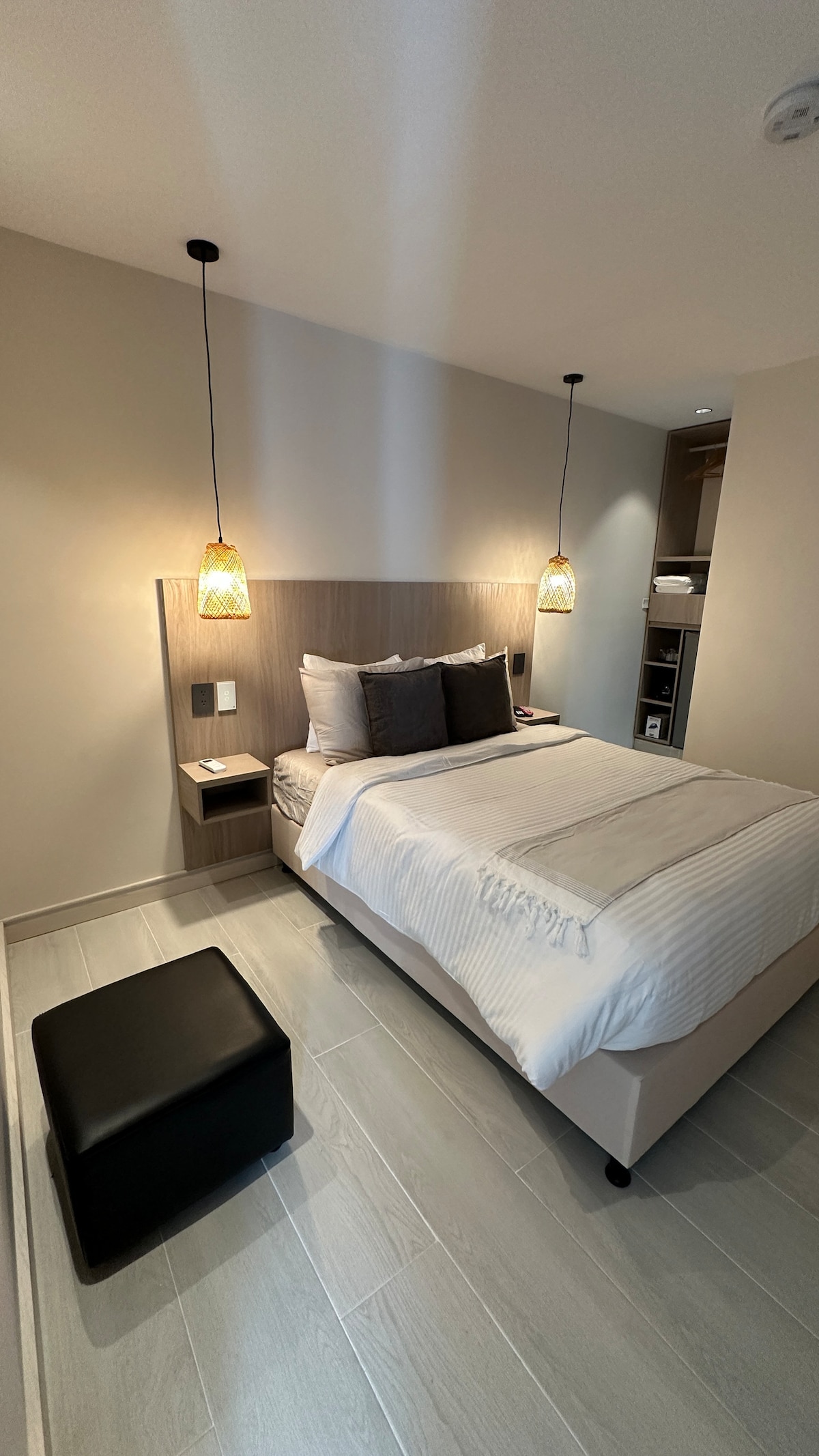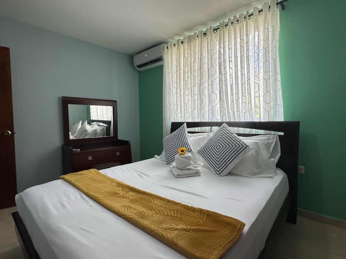 Apartamento de 100 Mts en un tercer nivel, en el moderno y nuevo edificio Cotton piece , cuenta con 3 amplias y confortables habitaciones con aire acondicionado así: una con 2 cama Dobles , tv , closet tipo vestier y baño privado , otra habitación con 1 camas doble y 1 cama nido sencilla , closet y tv , la tercera habitación un poco más pequeña tiene 1 cama doble ; el apartamento cuenta con 2 baños ; Sala comedor, cocina integral totalmente dotada, zona de lavandería, balcones y terraza