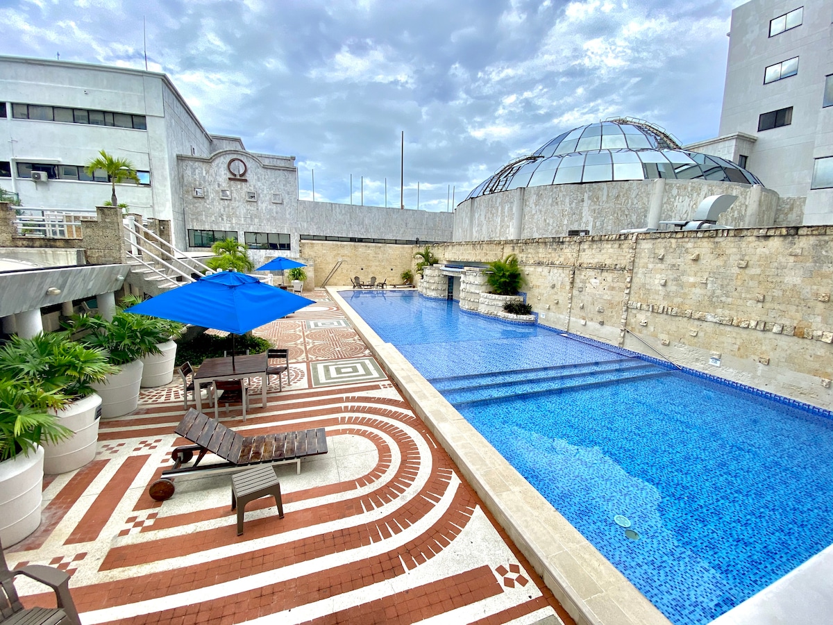 Apartamento de 110.69 mts2, dos habitaciones, muy bien ubicado. Servicios de recepción 24horas, 2 piscinas privadas (una con área infantil), cancha de tennis, gimnasio, snack bar, restaurante, discoteca, caja fuerte, cuna de viaje... Todos los lujos del Hotel SUNRISE (5 estrellas) en un apartemento privado. Exelente servicio y atención.