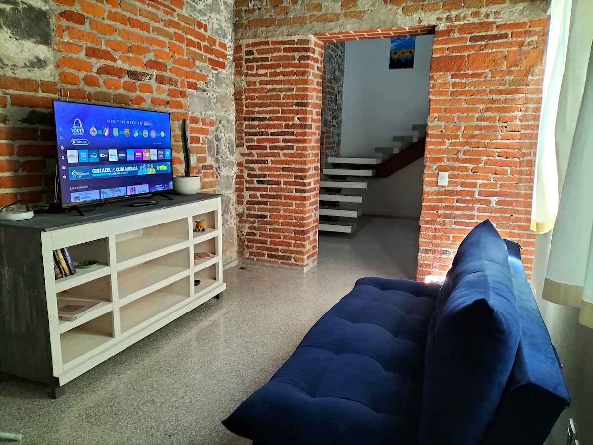 Un departamento bonito, chico en una zona historica de Puebla, de un nivel con entrada totalmente independiente, bien iluminado con amplios ventanales decorada estilo minimalista. Cuenta con sala de estar, comedor y cocina integral totalmente equipada; una recamara con camas matrimoniales y baño completo, con un pequeño jardin. Tiene los servicios de gas estacionario, calentador solar, tv, microondas, cafetera, licuadora, sabanas, lamparas así como productos de limpieza.