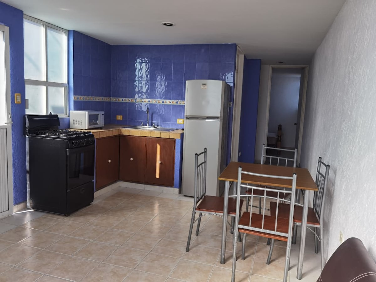 This ground floor apartment is located in an excellent location, just steps away from San Pedro Cholula market and a few blocks from the historic downtown and Cholula pyramid. The area is very safe and everything is nearby, restaurants, bars, and the archaeological zone. The apartment features a bedroom with a comfortable King Size bed, kitchen, living room with cable TV (Smart TV ), and is equipped with fiber optic internet and all the amenities for a pleasant stay.