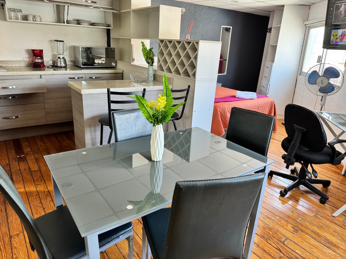 Visit Puebla staying in this quiet space in one of the best locations in the city. Spacious, independent, with private bathroom, walk-in closet, desk, dining space, stove, sink, microwave oven, refrigerator, WiFi, TV and fan. Close to Angelópolis Shopping Center, Estrella de Puebla, Museums, Art Park, Universities, Hospitals, Shopping, entertainment and restaurants. The neighborhood is semi-closed, quiet and guarded.