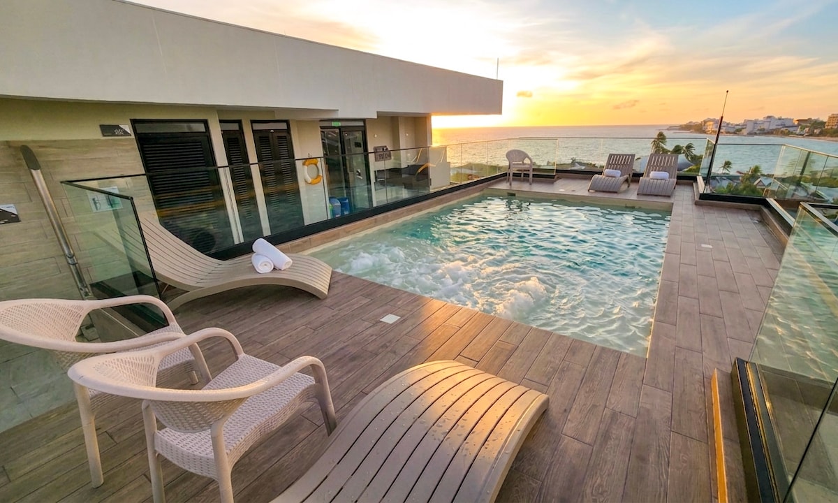 Apartasuite para estrenar en primera línea del mar, a tan solo 5 minutos del aeropuerto. Ideal para parejas o familias pequeñas que buscan ubicación, comodidad y lujo. Cuenta con cocina totalmente equipada, recepción 24/7, jacuzzi, parqueadero gratuito y mucho más. La propiedad cuenta con dos camas (nicho), cada una de 1.60 mts, un escritorio para trabajar y una terraza libre de ruido.