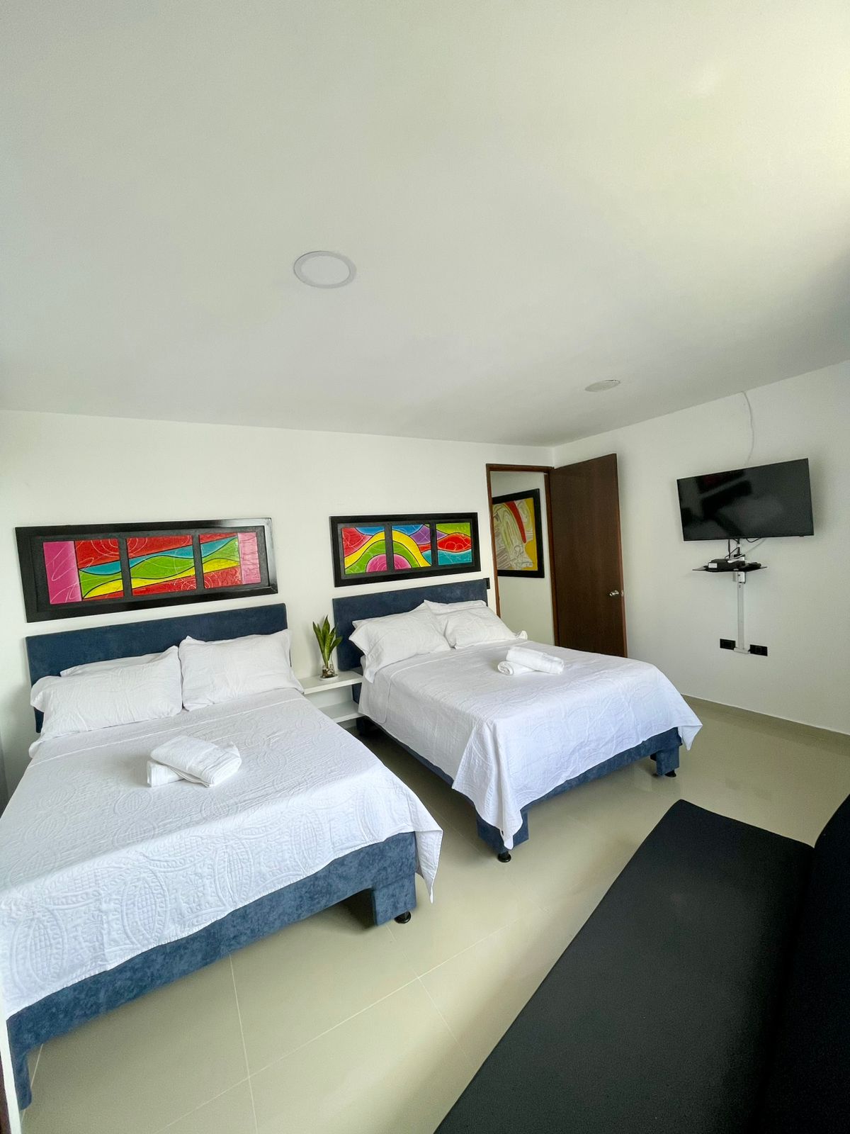 Apartamento de 100 Mts en un tercer nivel, en el moderno y nuevo edificio Cotton piece , cuenta con 3 amplias y confortables habitaciones con aire acondicionado así: una con 2 cama Dobles , tv , closet tipo vestier y baño privado , otra habitación con 1 camas doble y 1 cama nido sencilla , closet y tv , la tercera habitación un poco más pequeña tiene 1 cama doble ; el apartamento cuenta con 2 baños ; Sala comedor, cocina integral totalmente dotada, zona de lavandería, balcones y terraza