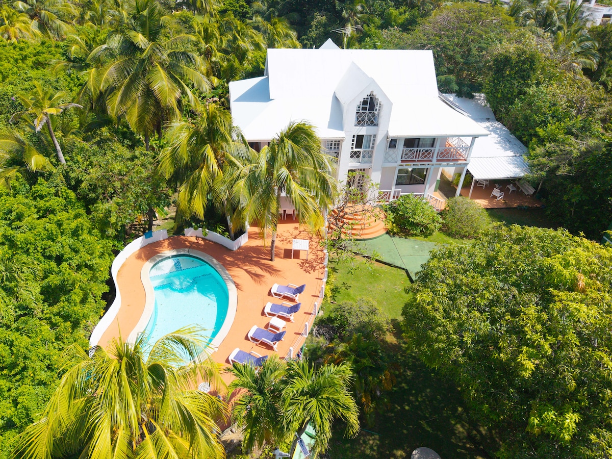 A two-story family house in San Andres Island, with a capacity for 14 people. Five comfortable bedrooms with en suite bathrooms (two of the rooms upstairs share a bathroom). A fully-equipped kitchen, and a living and dining room to enjoy the best time with your family and friends. Central A/C (mini-split A/C in bedrooms and rooms), family room, cable TV, drinking water, heater, washing and drying machines.