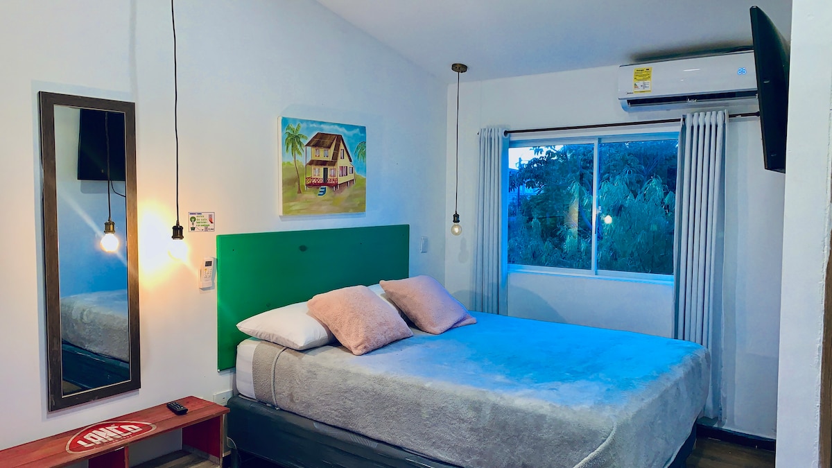 tiene 5 habitaciones, cada una con su entrada independiente, internet gratuito funcionando a tope, aire acondicionado, pequeño armario, baño privado, agua dulce, tv con cable y nevera. La habitación #2 tiene capacidad para 2 personas una cama doble y una cama sencilla. Tenemos una cocina cómoda que pueden disponer de ella. Estamos ubicados al noroeste de San Andrés Isla, 10 minutos (300 metros) caminando a la playa principal, y 5 minutos al centro.