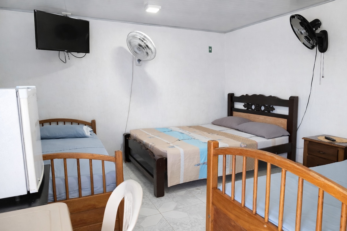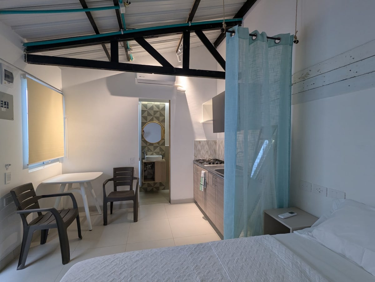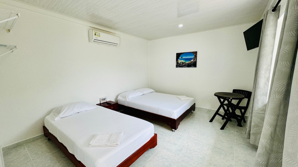 Apartaestudio, habitación mas sala cocina que cuenta con baño y ducha, armario, una cama doble 4 sencillas, 2 sillones individuales, aire acondicionado, nevera, estufa, gabinetes equipados, WiFi y televicion por cable. Totalmente independiente, hubicado en zona urbana por la avenida 20 de julio a pocas cuadras del centro y playa principal, cerca encuentras supermercados ,restaurantes y comida rápida.