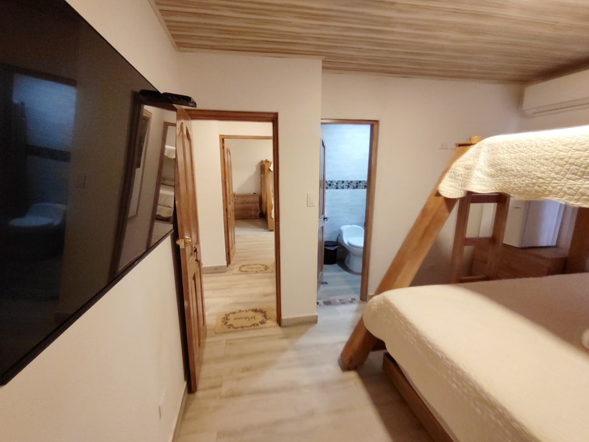 CASA CHALETT (1) Alcoba doble con cama king o 2 camas sencillas, Aire acondicionado, closet con caja de seguridad, 1 Habitación cuádruple , aire acondicionado, tv satelital, closet, sala cocina equipada, barra americana de 3 puestos, 1 baño con ducha, balcón con mesa de cuatro puestos. está podría ser una opción perfecta para ustedes. (cupo máximo 6 Pax).