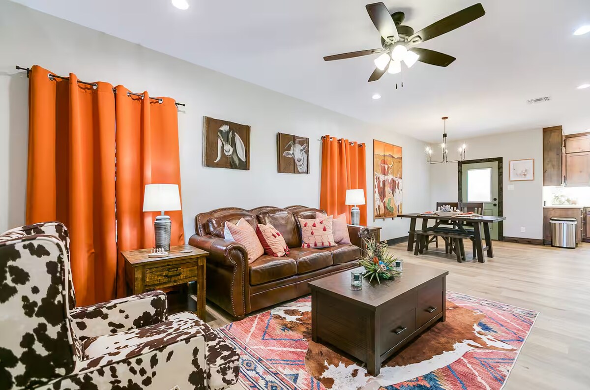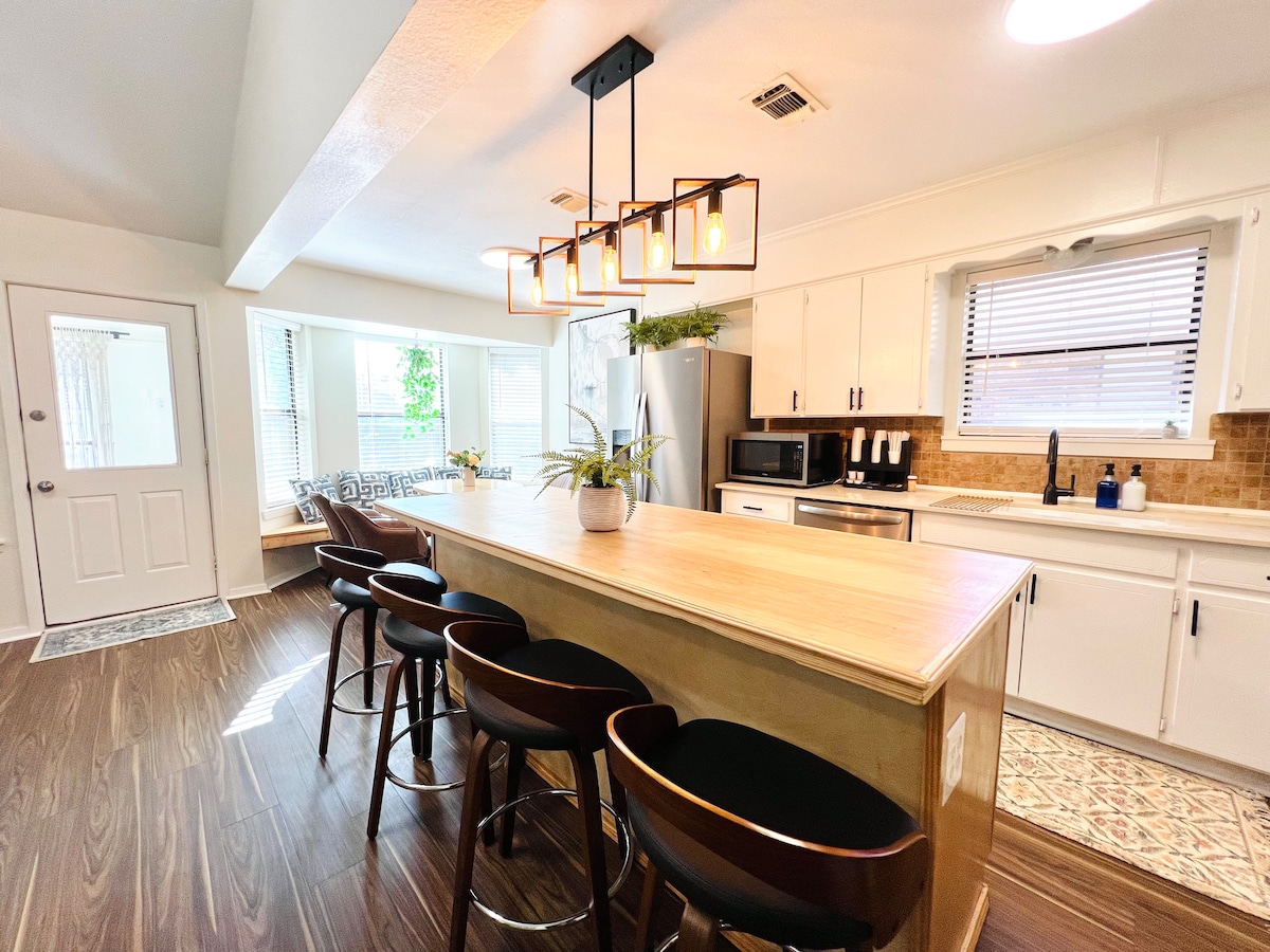 This stylish San Angelo townhome blends charm with modern comfort—perfect for a cozy stay. From the warm brick exterior and glowing evening lights that welcome you home, to the chic interior featuring vaulted ceilings, rich cabinetry, and every detail has been thoughtfully crafted. The open living area flows seamlessly into a modern kitchen with a stunning brick island and industrial-style barstools. This space is designed to feel like a boutique retreat with all the comforts of home.