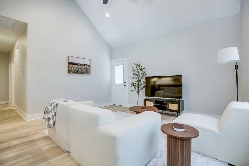 This stylish San Angelo townhome blends charm with modern comfort—perfect for a cozy stay. From the warm brick exterior and glowing evening lights that welcome you home, to the chic interior featuring vaulted ceilings, rich cabinetry, and every detail has been thoughtfully crafted. The open living area flows seamlessly into a modern kitchen with a stunning brick island and industrial-style barstools. This space is designed to feel like a boutique retreat with all the comforts of home.