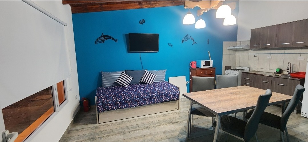 monoambiente muy amplio, para 2-3 personas, adaptado para personas con movilidad reducida, a solicitud colchón antiescaras. WiFi, tv. smart, heladera, cocina con horno, vajilla basica,sábanas, calefacción. ventilador, muy fresco. Área de parrilla, asador, disco, con mesas y sillas en exterior. Estacionamiento y parrillas compartido. Cuenta también con un futton que puede ser utilizado para dormir niños. A solicitud cuna practicuna.