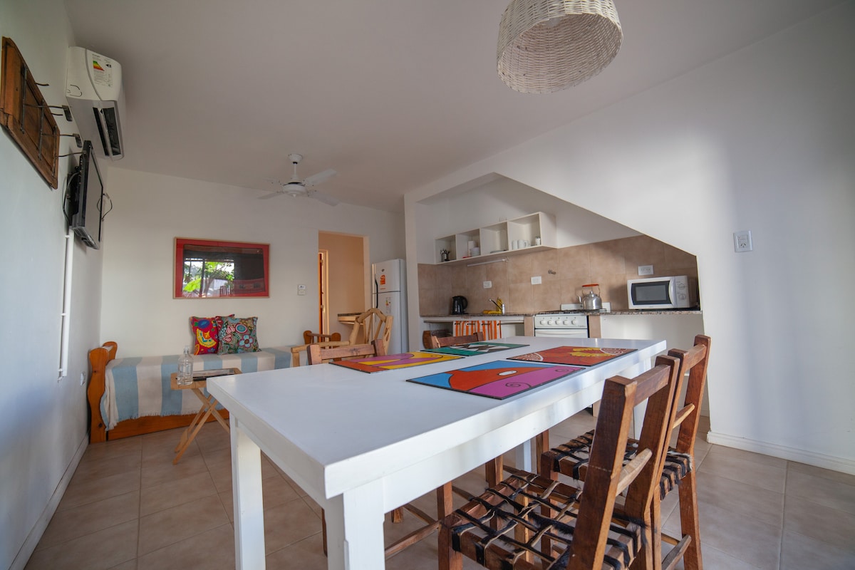 monoambiente muy amplio, para 2-3 personas, adaptado para personas con movilidad reducida, a solicitud colchón antiescaras. WiFi, tv. smart, heladera, cocina con horno, vajilla basica,sábanas, calefacción. ventilador, muy fresco. Área de parrilla, asador, disco, con mesas y sillas en exterior. Estacionamiento y parrillas compartido. Cuenta también con un futton que puede ser utilizado para dormir niños. A solicitud cuna practicuna.