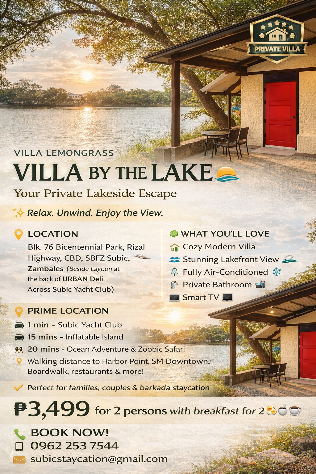 VILLA BY THE LAKE 🌅 Your Private Lakeside Escape ✨ Relax. Unwind. Enjoy the View. 📍 Located at the back of URBAN Deli Across Subic Yacht Club 🏡 Cozy Modern Villa 🌊 Stunning Lakefront View ❄️ Fully Air-Conditioned 🚿 Private Bathroom 📺 Smart TV ☕ Outdoor Seating Area
