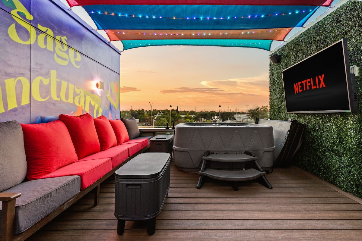 2 Bedrooms, 2 Baths - 845 sq ft. Newly renovated! Modern apartment, 1.5 miles from Downtown and the Riverwalk. Hotel quality linens! Fully equipped (all the basics and more), Full washer/dryer, kitchen, and private guest-only use patio with gas grill and private outdoor lounge and 5-seat hot tub. Self check-in, keyless entry, wifi, smart tvs with Roku and Hulu Live No Commercials plan. Enabled for your Netflix, HBO Max, Paramount+, Disney+, etc. Airplay. High-speed wifi included.