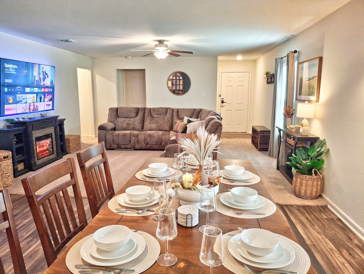 A gorgeous two-story home in a friendly suburban neighborhood just minutes away from popular destinations like Six Flags Fiesta Texas, La Cantera Mall, and The Rim. Enjoy the Texas sunset with a captivating overlook of the city from the back porch or large windows. Features: - 5 Bedrooms - 3 Full Bathrooms - 2 living rooms with luxurious couches - Fully stocked kitchen - Fiber Wifi - Smart TV's in every room - Large backyard for dogs to play - Patio and balcony - Washer and dryer