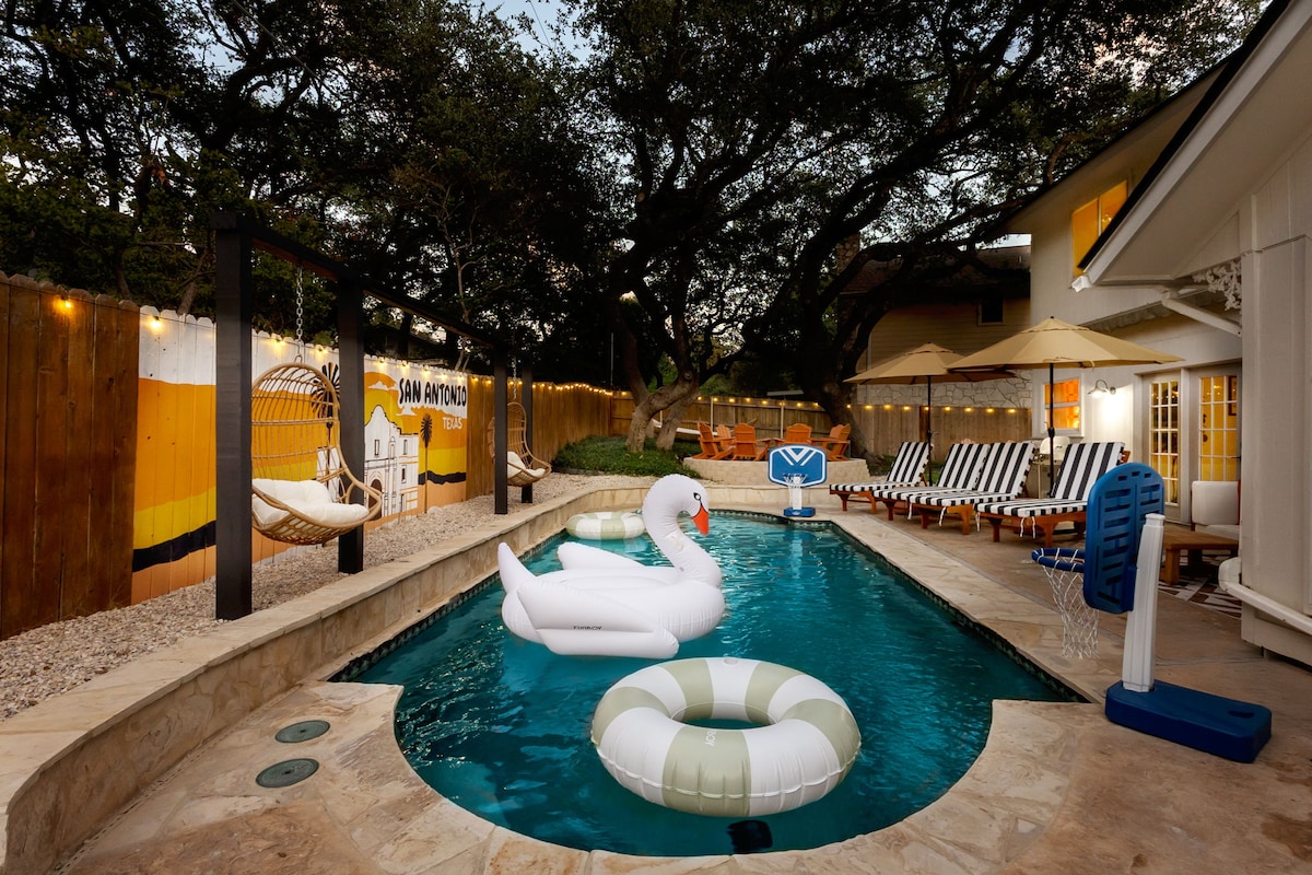 Looking for the perfect getaway located in the ideal location? Our beautiful home is right next to the airport, and very close to downtown, Six Flags, and other attractions! Equipped to serve families with little children or just friends looking for a fun getaway. Enjoy the beautiful gated pool, smokeless fire, games, outdoor lounging areas, and more. Home is outfitted with luxurious king and queen Nectar mattresses, large Roku TVs, outdoor games, high-chair, pack'n'play, kids food-ware, etc.