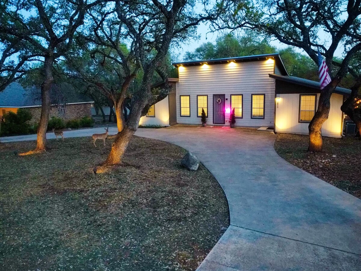 You will not a find a better view than right here! This unique, un-comparable, mid-century modern, contemporary flair home includes a private Swim Spa (Hot-tub & Pool) with a stunning view to the nature, one of a kind oversized stained deck and an amazing covered patio with BBQ, outdoor firepit,master suite, arcade, air hockey, ping pong, private parking and a huge backyard with mature Texas Oaks. Located in a quiet neighborhood with complete privacy, minutes from Fiesta Texas & Sea World