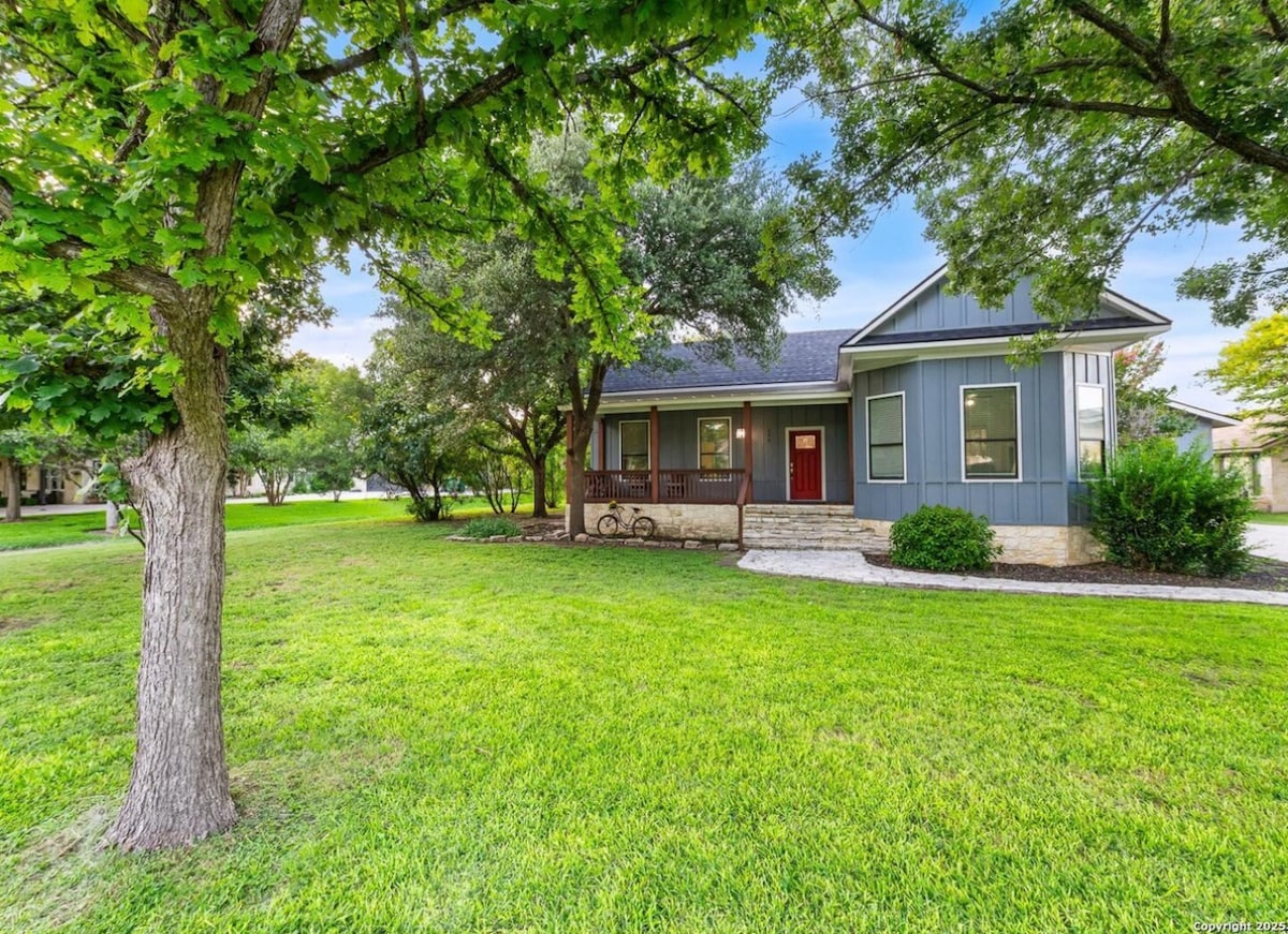 You'll love this unique escape to a one-of-a-kind tiny home just 1 mile from iconic Floore’s and Old Town Helotes—filled with coffee shops, bakeries, wine, bars, boutiques, and monthly Market Days. This retreat features reclaimed materials, stargazing skylight over the bed, screened front porch overlooking the beautiful pond, outdoor shower under the stars, trails, golf green, basketball court, pickleball court, corn hole, washers, and more. Peaceful, and full of Hill Country soul and character!
