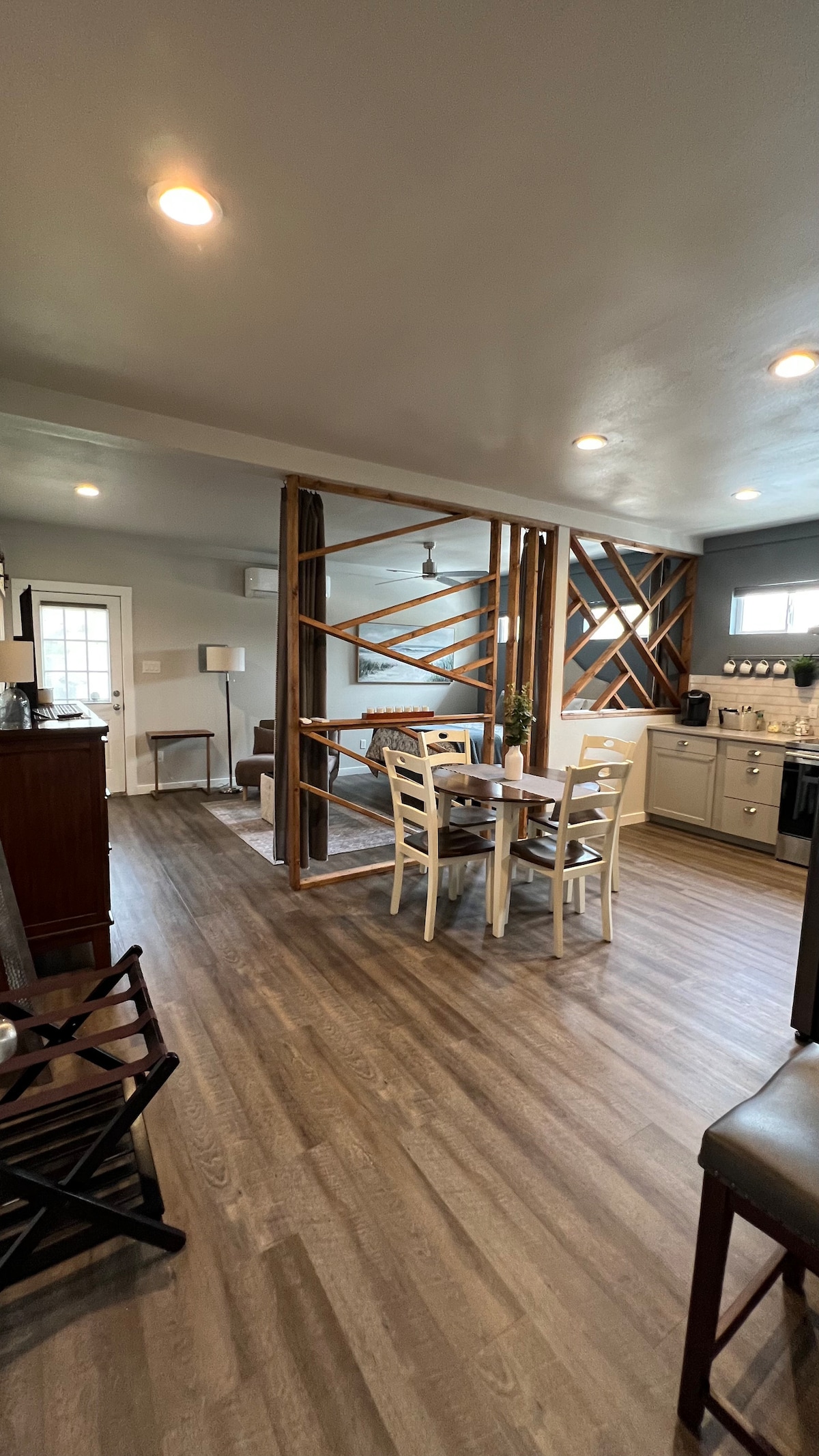 2 Bedrooms, 2 Baths - 845 sq ft. 2nd Floor Modern apartment, 1.5 miles from Downtown and the Riverwalk. Hotel quality linens! Fully equipped (all the basics and more), Full washer/dryer, kitchen, and private guest-only use patio with gas grill and private outdoor lounge and 5-seat hot tub. Self check-in, keyless entry, wifi, smart tvs with Roku and Hulu Live No Commercials plan. Private apartment over detached 3-car garage.