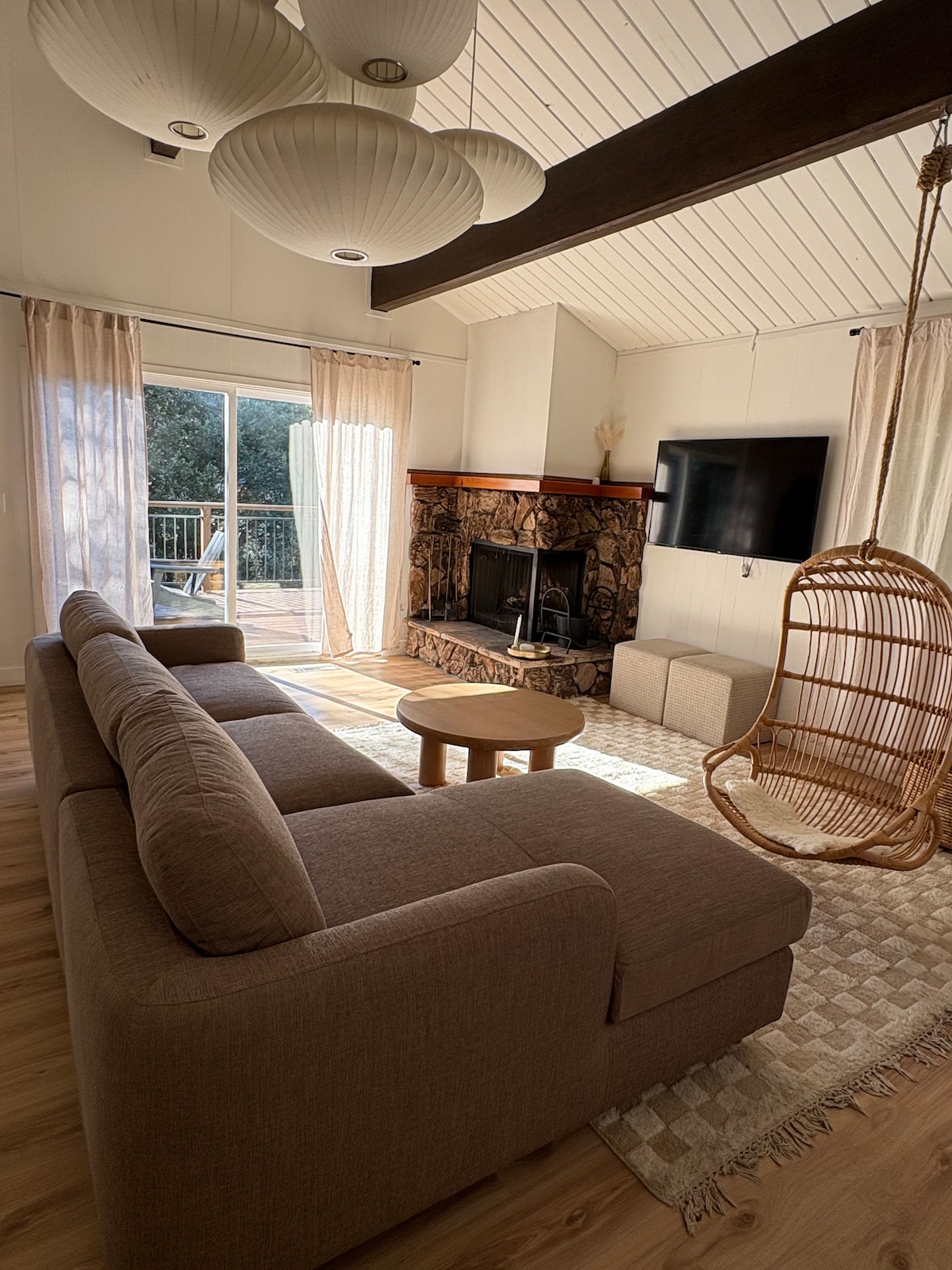 This Black A-Frame cabin sits high among the pines in Running Springs, offering peaceful treetop views from decks on all three levels. With warm mid-century modern design, it’s the perfect romantic escape. Snuggle in the cozy loft, enjoy vinyl or a movie in the secret cinema room, and unwind together in the new barrel sauna. Perfect for couples celebrating anniversaries, honeymoons, special getaways, or simply enjoying quiet, meaningful time together in the forest.