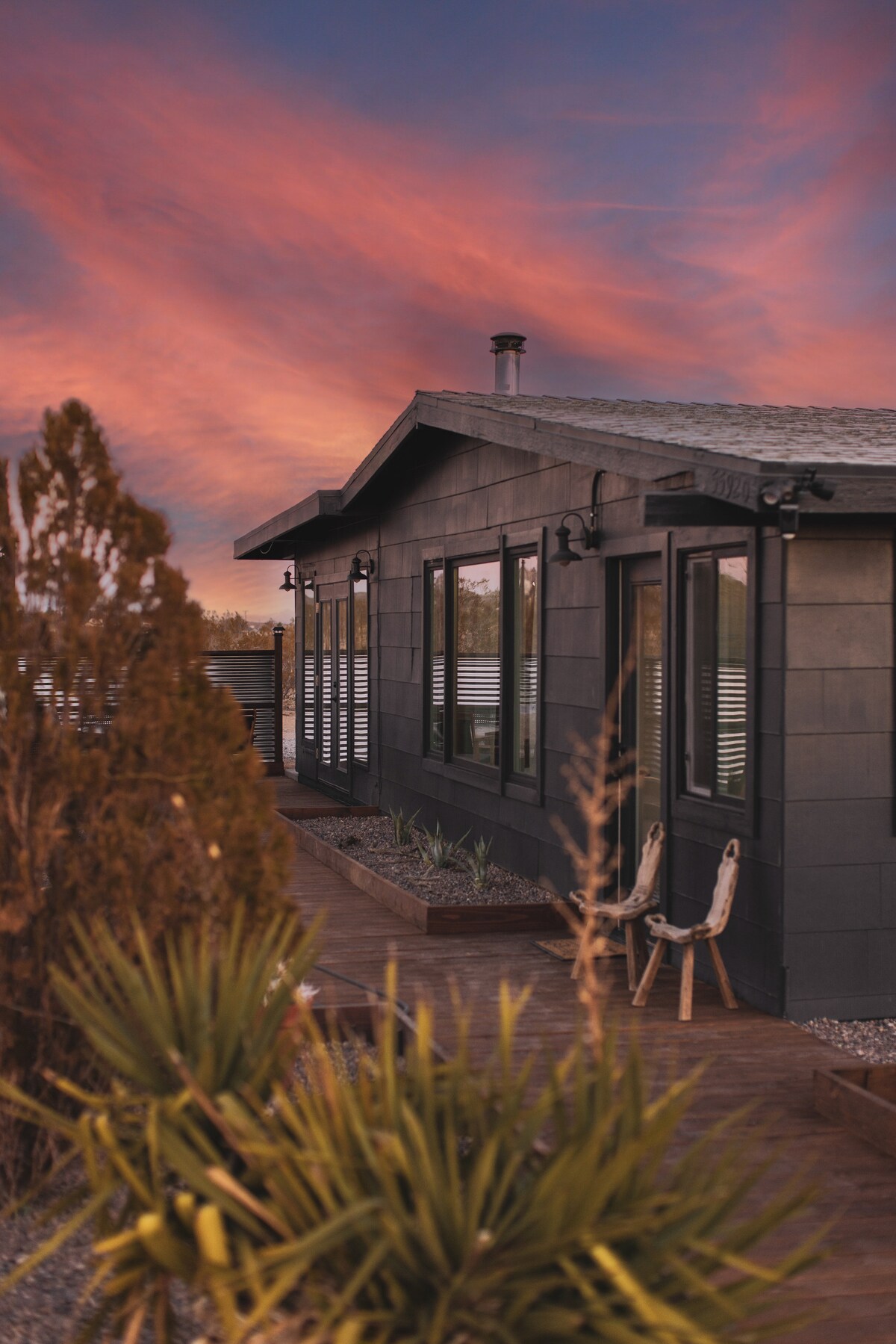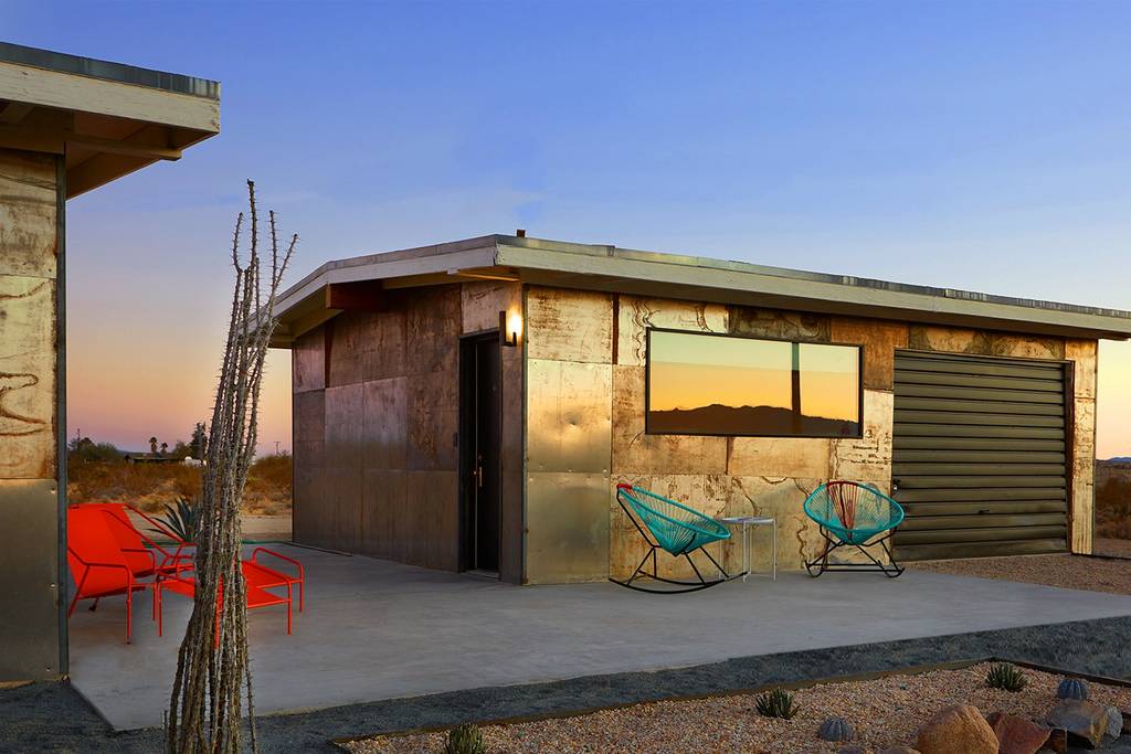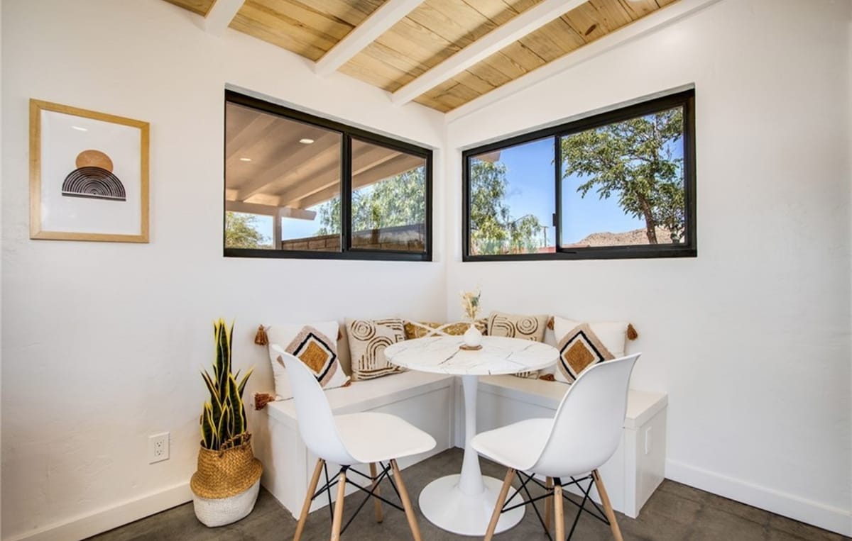 A design-conscious retreat w/ mountain views! >>this is the place honors form + function equally with solid brass fixtures, a copper bartop, stained concrete floors, and vintage cotton Matteo linens. Curated modern + vintage elements blend to cultivate a space of rest, reflection & creative flow. Private outdoor space with gas firepit & grill. Within easy walking distance of Noah Purifoys Outdoor Art Museum. 8min to downtown, 15 to the park. Our modern sanctuary is ideal for the art-minded soul.