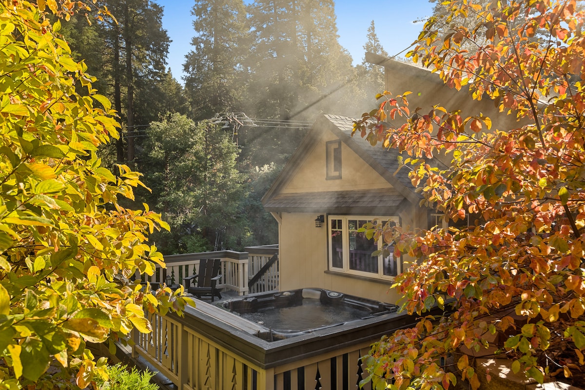 Bear Mountain Loft is your mountain escape! This beautiful pink A-frame is situated in Moonridge, 5 minutes from Bear Mountain and walking distance to trails and sledding spots. Take advantage of the winter with the fire place, gourmet kitchen, and access to restaurants. Enjoy floor-to-ceiling private tree views from the living room or bedroom loft, or relax in the hot tub after a day in the snow. We love families and dogs, and hope that you love our home as much as we do!