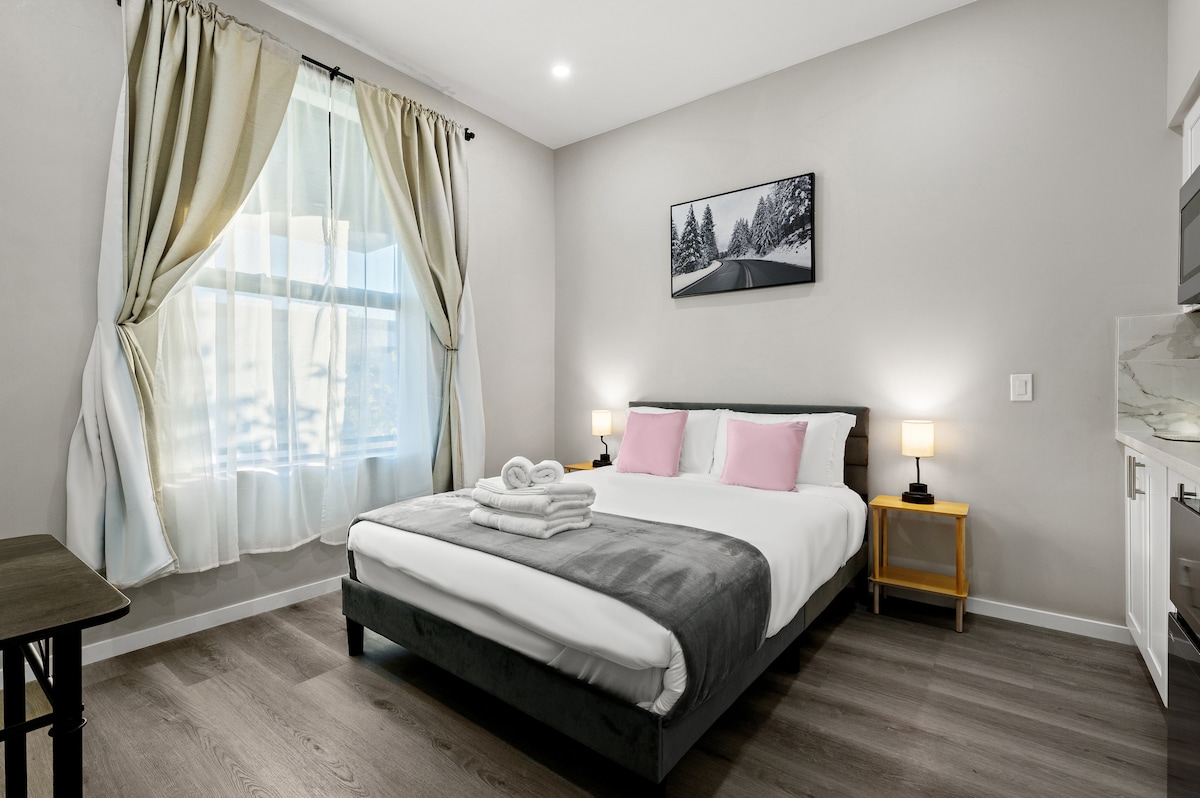 现代单间公寓,配备加大双人床、工作空间、小厨房