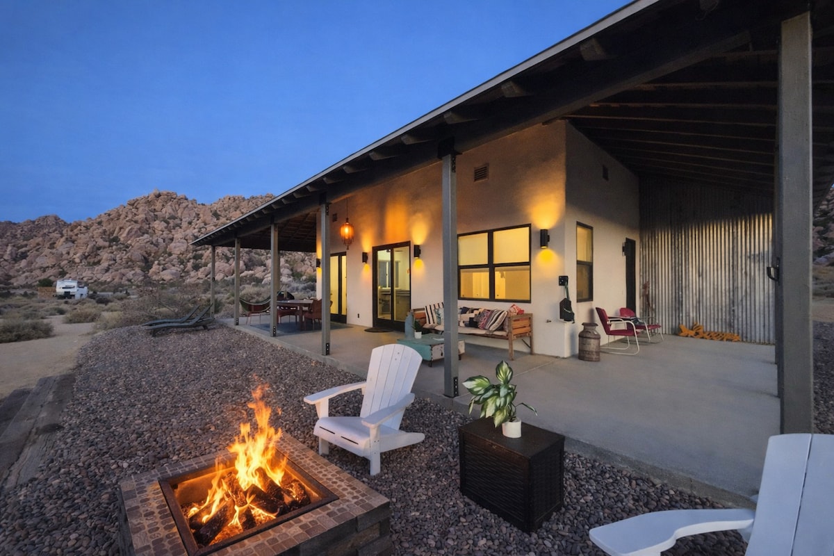 Vesper House: Luxe boulder hideaway just 3 minutes to the Joshua Tree National Park entrance. Seclusion and privacy, views in every direction and designer furnishings. Outside, enjoy a conversation by the fire pit or in the 6-person hot tub nestled at the foot of the majestic boulders. Take a refreshing outdoor shower to cool off. A BBQ grill and an 8-person outdoor dining table are perfect for hosting dinners. IG: @vesperjt