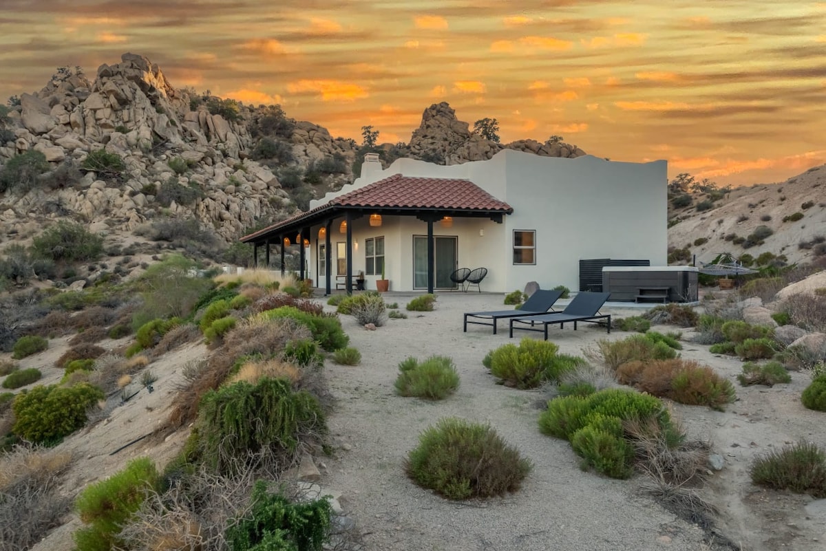 White Desert House: Luxe hideaway in a magical spot on 2.5 acres with privacy, quiet, and stunning vistas, but still just 15 minutes to Joshua Tree and 5 minutes to downtown Yucca Valley. Bordering the exclusive Rock Reach neighborhood, the house is perfect for a relaxing getaway while being central to conveniences. Outside, enjoy the fire pit and a hot tub under the stars among Joshua Trees and cacti. Inside, designer furnishings and comfortable beds await. IG: @white_desert_house