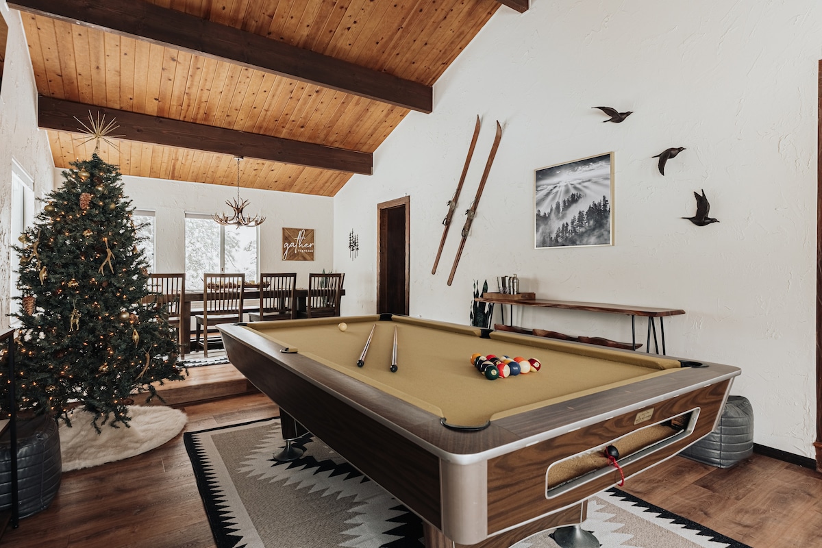 Escape to Big Bear, CA, in our 5 bedroom, 2 level cabin for up to 12 guests. Enjoy 7 x 4K TVs, multiple living areas, media room, a large loft, and a small gym. Stay entertained with foosball, air hockey, shuffleboard, horseshoes, cornhole, darts, and 1,000's of arcade games. The digital game board table adds a modern twist to classic board games. You'll be surrounded by wildlife and tranquility - it's the perfect retreat for you, your family and friends! Book your getaway today!