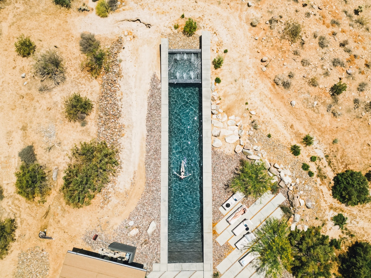 Created as a sacred space to connect with the desert’s beauty, Skyfall is a soulful yet elegant home that merges an organic modern aesthetic with the natural surroundings. Resting on 2.5 acres of majestic land just outside Joshua Tree National Park, this property is home to ancient boulders, native plants, and abundant wildlife. While here, we invite you to soak in the saltwater pool and spa, gaze at the Milky Way under the night sky, or capture the radiance of the sun setting over the horizon.