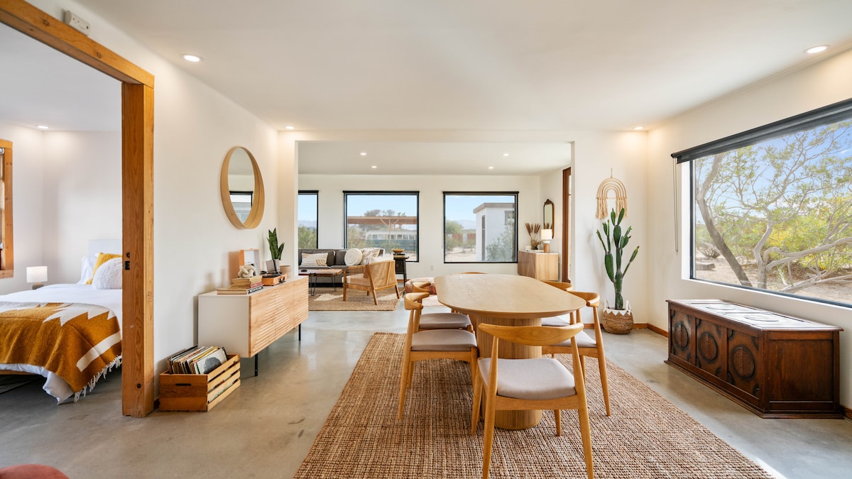 Welcome to a sanctuary for reflection, creativity, and stillness. This thoughtfully curated hideaway features a large soaking tub and access to the stunning shared pool and hot tub at High Desert Protocol. Set two miles up a quiet dirt road, this ever-evolving 6-acre desert compound borders public land—offering a rare sense of vastness, privacy, and possibility, perfect for seclusion and connection. (Interested in a full buyout? The entire property sleeps 16 guests. Inquire for details.)