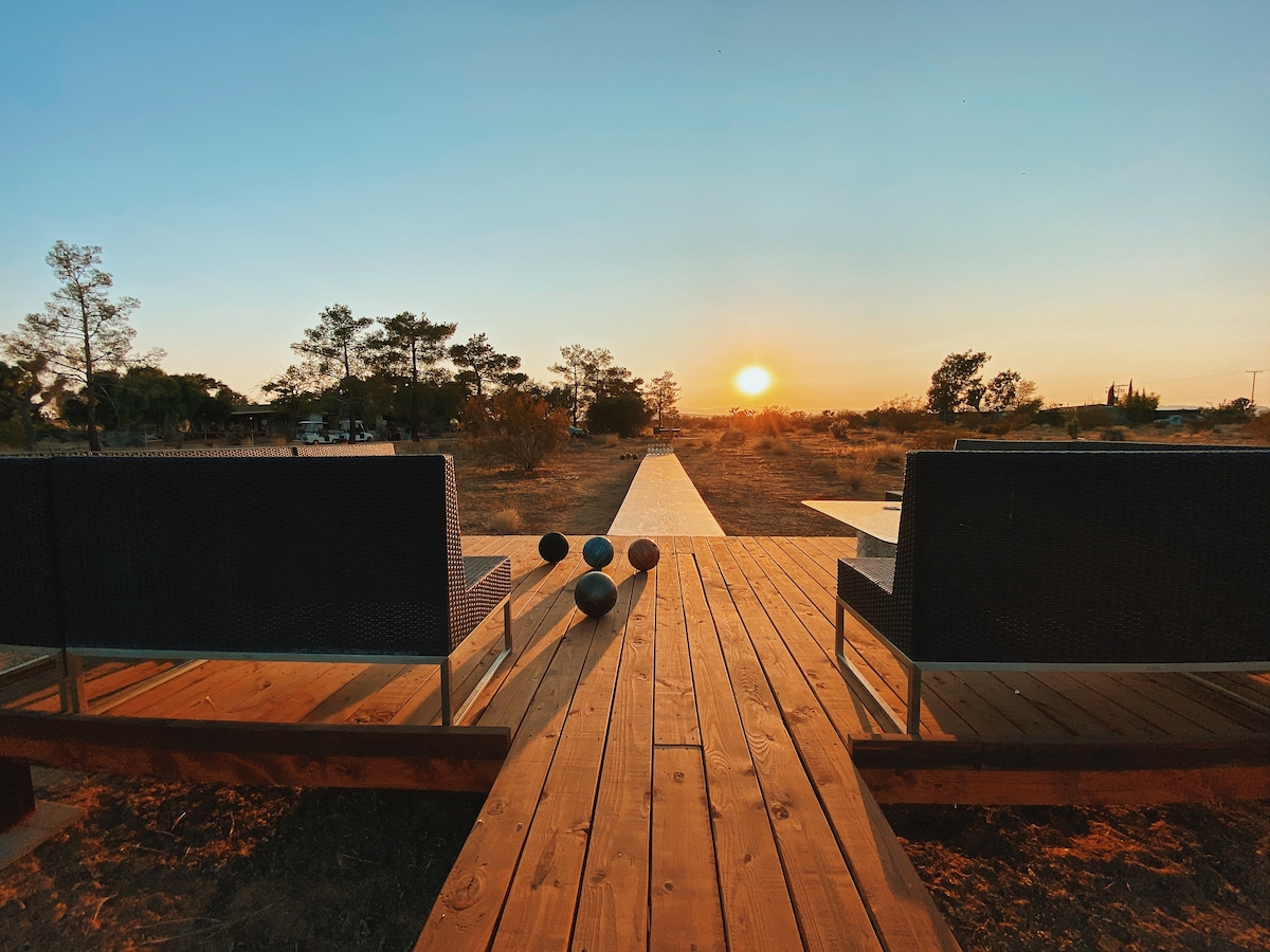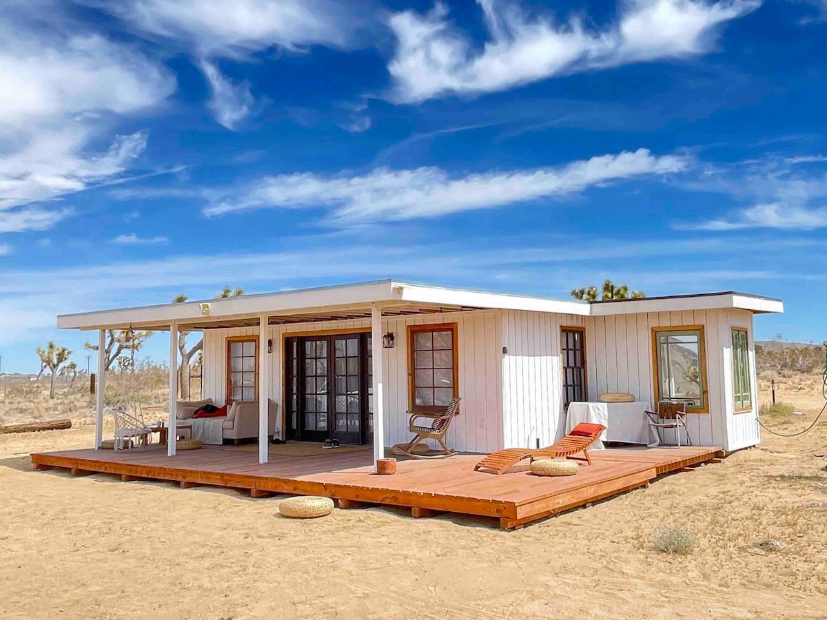 An exceptionally exquisite experience in the heart of Joshua Tree! We've designed the space specifically for vacationers visiting the high desert and have no rock left unturned. This 2 bedroom/1 bath villa is located just minutes to all the attractions in the High Desert. Joshua Tree Park, Pappy & Harriets, Shopping & More. Bathe in our specially designed Side by Side outdoor bathtubs and shower with a glorious wrap around patio. Suspended swings, jacuzzi and stars like you've never seen.