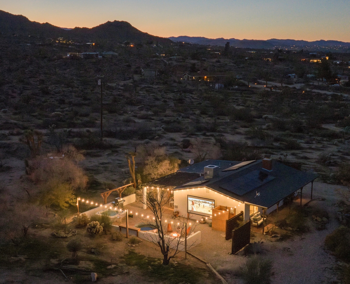 Gaze at the endless night skies while sitting on the porch swings or soaking in the hot tub from this well appointed desert home. Decorated with style & comfort, the outdoor fire table, solarium, movie room & chic furnishings make it an ultimate private escape that feels like home. On 2.5 acres conveniently located off a paved road, our horseshoe driveway provides ample parking inside our fenced-in property. The 1900 square foot home has been recently and creatively remodeled with an open-concept upcycle theme boasting clever features and luxurious amenities. Fusing eclectic furnishings and modern conveniences, my home is smart. Lock and unlock the front door with your smartphone. Temperature control via a Nest learning thermostat. Control lights, music and entertainment with voice command via an electronic assistant. Link your bluetooth phone to the soundbar, nostalgia music unit and bedroom speakers. The living room, kitchen and dining area are open concept flanked by the living room picture windows and french doors which lead to a fully enclosed backyard patio solarium. The living room is a cozy hangout with a fireplace and vintage eclectic furnishings including a WWII weapons crate turned coffee table and a 1930's circle lamp. For fun, a nostalgia music station plays records, tapes, CDs, radio and bluetooth music. The kitchen boasts polished concrete counters, open shelving, Capresso coffee station, Nespresso machine, toaster, microwave, dishwasher, gas stove, full-size refrigerator/freezer with ice machine and everything you need for light cooking and dining. Counter seating, custom reclaimed wood trim, iron pipe accents and a desert-view window box will have you cooking and dining in style. Our dining area is a custom-built and matched upcycled picnic table lighted by a one-of-a-kind block light fixture built by an etsy artist. Our 700 square-foot media room is a set up for modern and old-fashioned fun. Pull the room darkening shades and lower the screen for a movie or challenge a chum to a head-to-head dart game. Peruse our board game collection or set up your laptop at the powered desk and get that work out of the way. Bring your passwords for your favorite app-based entertainment on the flat-screened 4k smart TV with built-in Roku. The movie screen is connected to an amazon fire stick. The commercial front-loading washer and dryer are available for guest use. The Milky Way Master bedroom has a California King bed, full-size closet, empty drawers, bedside plugs, ceiling fan, bedside fan, room-darkening curtains, bluetooth speaker and luxurious linens for a restful night's sleep. The newly remodeled master bath has an elongated toilet with bidet, shower and roman whirlpool tub to soak away your hike's aches and pains. Polished concrete counters, reclaimed wood trim and custom iron pipe hardware make the master bath a unique cozy retreat. The Cactus Garden Guest bedroom has a queen-sized bed, full-sized closet, empty drawers, bedside plugs, ceiling fan, bedside fan, bluetooth speaker, room-darkening curtains and luxurious linens. The guest bath has an elongated toilet, shower and bathtub with built-in grab bar. The outdoor living space includes an enclosed solarium with views for days. Open space with the polished concrete floor is calling for your yoga mat. A hightop teak dining set is great for morning coffee and evening drinks and any meal in between. The open porch has a polished concrete pad with two artisan-created double pallette swings with live edge wood arms and accompanying side table made from tree branches and upcycled pallettes. There is also an adjacent outdoor seating area with teak chairs, a outdoor patio heater and propane fire table. Make your way to the outdoor hot tub and soak up the desert vibes and night sky. The soaking patio has a hot tub, patio heater and outdoor lounging space with views for days. For fun, the side yard has a double horseshoe pit. To complete your outdoor experience, the backyard has a propane and charcoal combo barbeque for your outdoor cooking needs. Guests have access to the entire house and the fenced-in areas of the property. There is no garage access and we ask guests stay within the fenced area for your safety. Joshua Tree is a natural environment and there are coyote packs living in the region. We suggest guests review the natural features and hazards of the region prior to your visit. We are available 24/7 via phone for urgent matters and Alex is mere minutes away in an emergency. We are available to help if you need us but our focus is on your privacy. This retreat is nestled in an area with a rural feel surrounded by land and plenty of space. The home is close to all of the amenities that Joshua Tree Village offers and is only minutes to the natural wonders of the National Park.